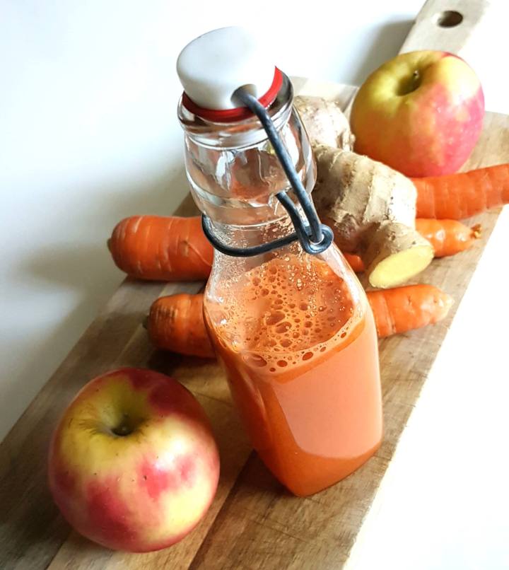 Denne gulrotjuicen smaker bare helt himmelsk med frisk ingefær og aromatisk eple. Både gulrot og eple inneholder mye væske så her får du mye juice for pengene. Gulrot inneholder betakaroten, omdannes til A-vitamin i kroppen, som er viktig for synet, huden, vekst og utvikling. I tillegg får du i deg kalium, folinsyre, jern, magnesium, kopper og andre mineraler vi stort sett får i oss for lite av. Gulrot bekjemper bakterier, senker blodets kolesterolnivå og hjelper mot anemi, kronisk tretthet , magesår, og tarmproblemer og så videre.. Trenger man flere grunner egentlig!?