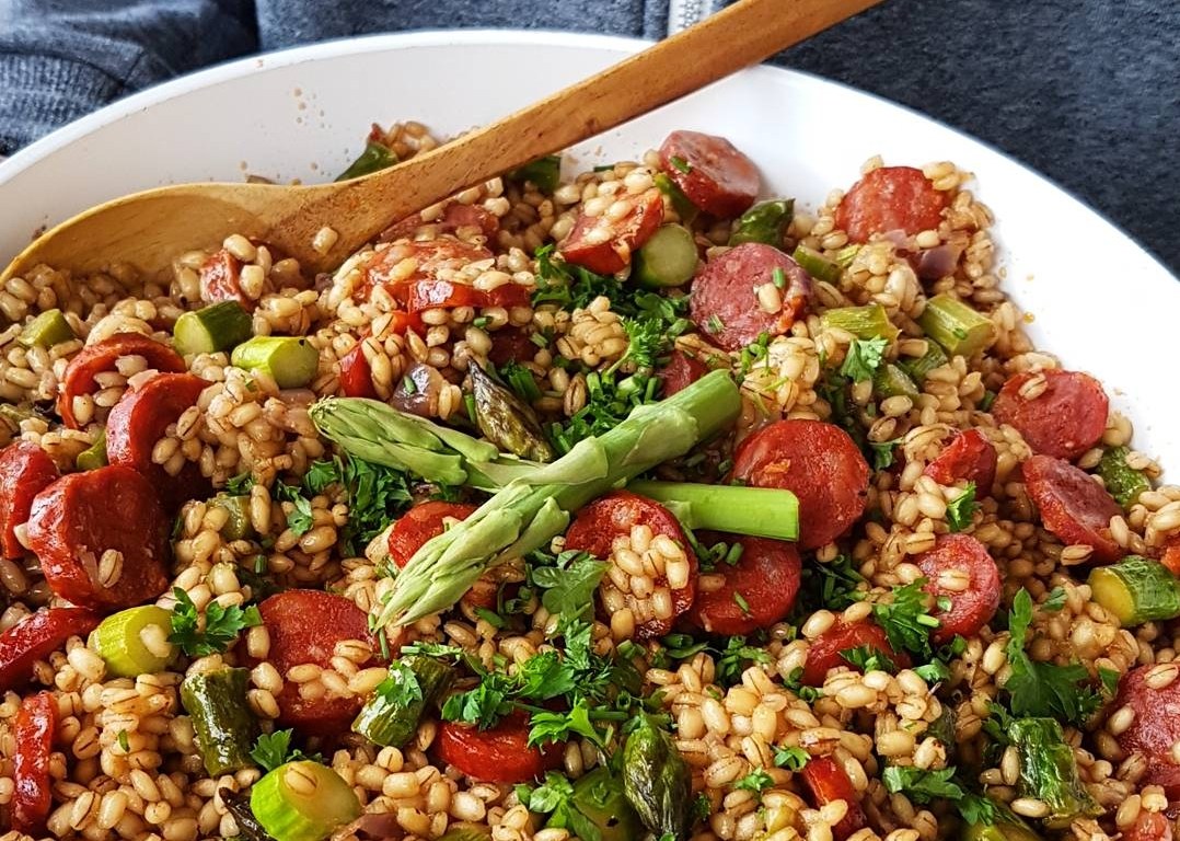 There’s a new king in town! Den nye kongen heter BYGGKORN. God på smak og fantastisk på næringsinnhold. Bytt ut den noe utskjelte risen med smakfulle og sunne byggkorn. Ikke bare er det sunnere, men det smaker fantastisk godt også. Mer tyggemotstand og nydelig mild og litt søtlig smak. Perfekt sammen med sterk chorizo og mild asparges. Byggotto er herlig hverdagsmiddag og smaker nesten enda bedre dagen derpå i lunchboksen, men kan også pimpes opp med sopp og serveres med rødvin til i helgene.