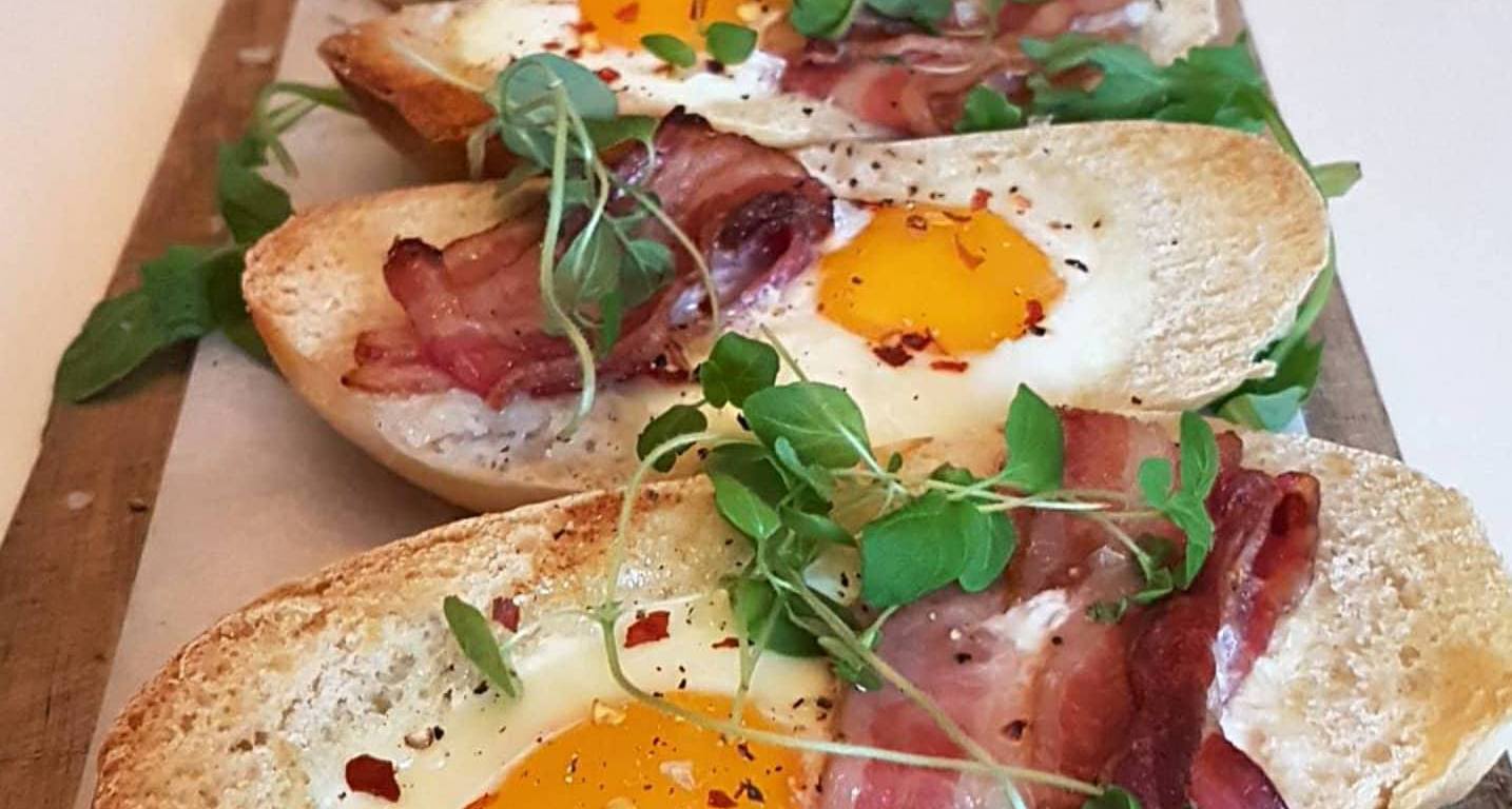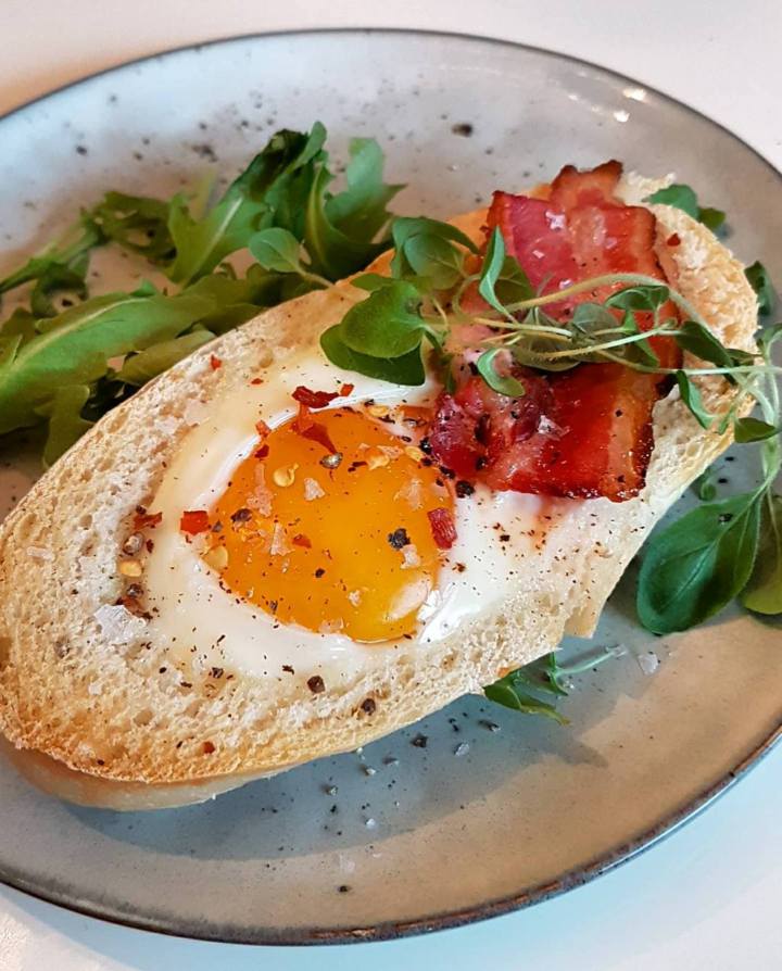 Hvis du slår sammen Snikgjest personlige matideologi om at «det enkle ofte er det beste» og livsfilosofien «alt smaker bedre med bacon» får du denne versjonen av «egg og bacon». Det aller beste er at du slipper å stå og steke både egg og bacon, og varme rundstykker. Denne versjonen lager seg selv og er perfekt å nyte i helgen når du har tid til å sette deg ned og spise et deilig måltid i fred og ro. Del rundstykket i to og grav ut litt av brødet med en skje. Knekk ett egg oppi og legg på en skive bacon. Eller to.. Det kan aldri bli for mye bacon! På den tiden du bruker på gå ned i postkassen å hente avisa rekker baconet å bli sprøtt og plommen nesten gjennomstekt. Du vil helst ha en myk og litt rennende plomme. Sunny side up. Så kan dagen begynne!
