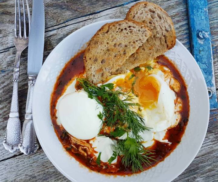 Tyrkiske egg med gresk dressing.. litt merkelig, men dette er et utrolig smakfullt måltid utenom det vanlige. Ønsker du å overraske noen med en unik frokost, lunch eller kjøttfritt måltid er dette virkelig å anbefale. Sunt og mye smak. Bløtkokte egg med flytende plomme, frisk og sunn gresk yoghurt med et hint av hvitløk, og toppet med et lunt og edgy chilismør. Disse frokosteggene tar ikke lang tid å lage og det tar nøyaktig samme tid om du lager til 1 person eller 4. Du kan steke speilegg, hardkoke egg eller posjere egg. Yoghurten rører du sammen mens eggene tilberedes. Chilismøret lages enkelt ved å smelte smør og tilsette chiliflak. røkt paprikapulver og finhakket dill og persille. Server eggene med ristet brød og digg inn. Når den myke plommen blander seg med yoghurt og chilismør skjønner du hvorfor disse tyrkiske eggene er så himla gode.