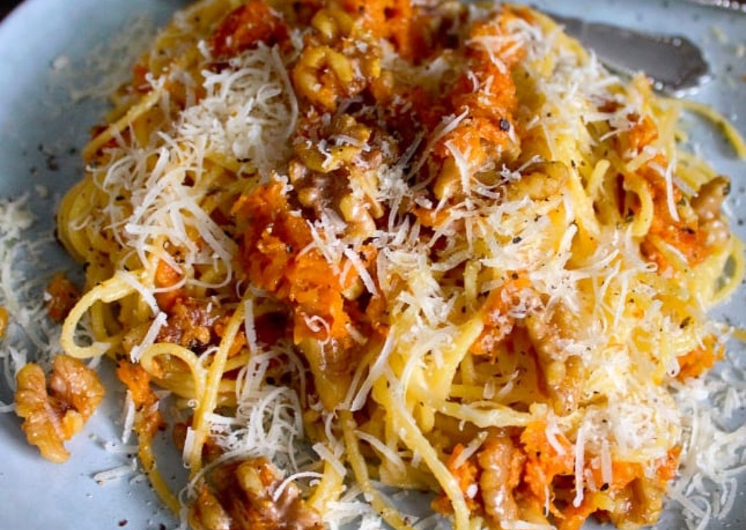 Legg ferdigkokt spagetti på en tallerken. Topp med revet parmesan. Til slutt legger du på gresskar og valnøtter. Nyt!