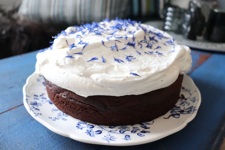 Pisk 3 dl kremfløte og 5 ts granskuddsukker. Bre godt over kaken når den er kald. Sprinkle tørket kornblomst over. Server og nyt med god samvittighet. Gratulerer så mye med morsdagen alle sammen❤