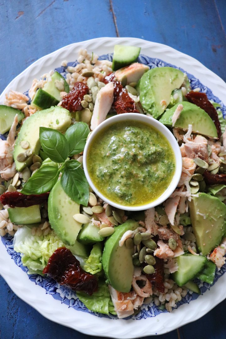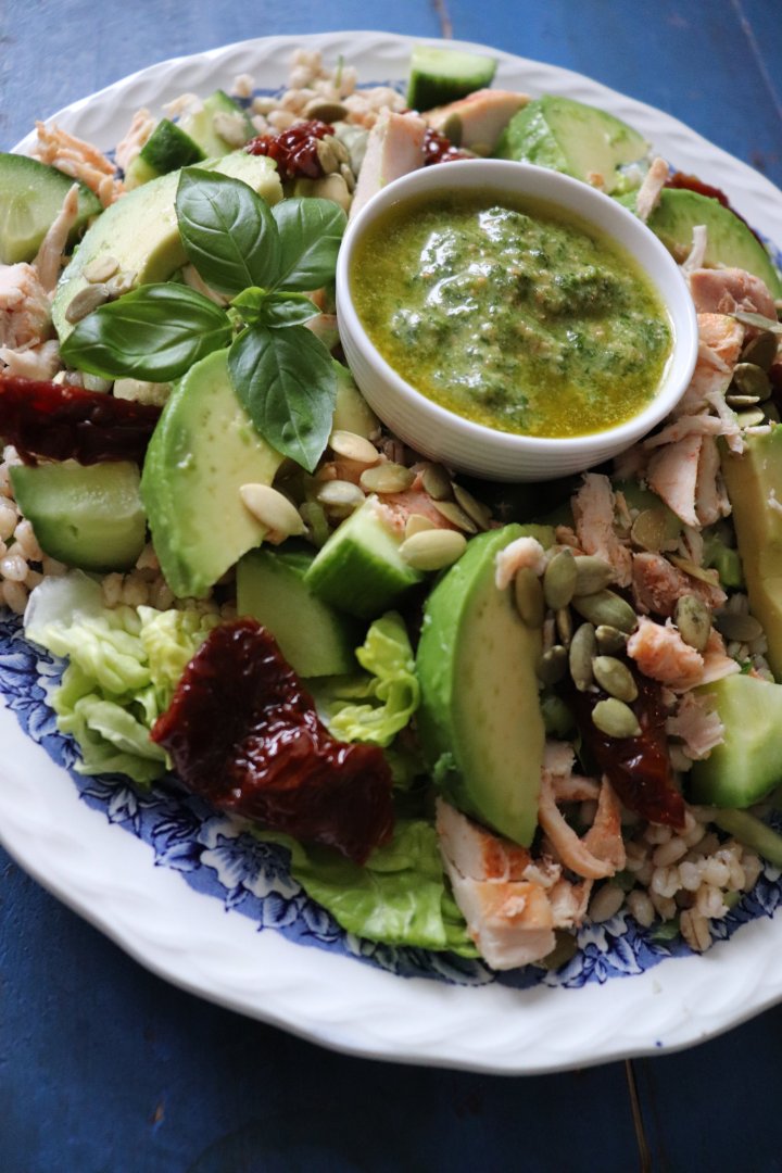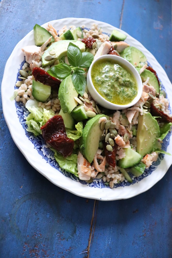 Anrett ved å legge salat på tallerken først. Hjertesalaten bryter du i store biter med hendene. Legg på godt med byggryn. Fordel kylling i biter. Skjær soltørka tomat og rødløk i strimler og legg på. Avokadoen deles i 2 og graves opp med en stor spiseskje. Del de to halvene i 0.5 cm tykke båter og fordel jevnt utover. Topp med pesto eller server pestoen i en skål ved siden.