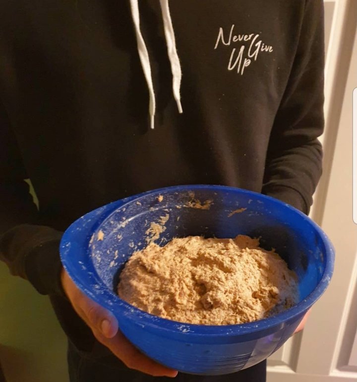 Ha alle de tørre ingrediensene i en stor bakebolle. Rør honning ut i litt lunkent vann eller bruk flytende. Lynghonning passer perfekt i smak til spelt, men all honning funker. Har du ikke honning bruker du en spiseskje rørsukker. Rør inn kaldt vann og honning i deigen. Se an vannmengden. Mengden vann du trenger for å få en jevn og fin deig varierer med type melsort, melets alder og hvordan melet er oppbevart. Mel skal oppbevares «kaldt», mørkt og tørt. Det er lett å glemme at mel en gang i tiden har vært en plante som har stått ute på jordet i all slags vær og vind og trukket til seg næring fra jorda. Selv om kornet kvernes til et jevnt og fint mel kan vanninnholdet i melet variere.