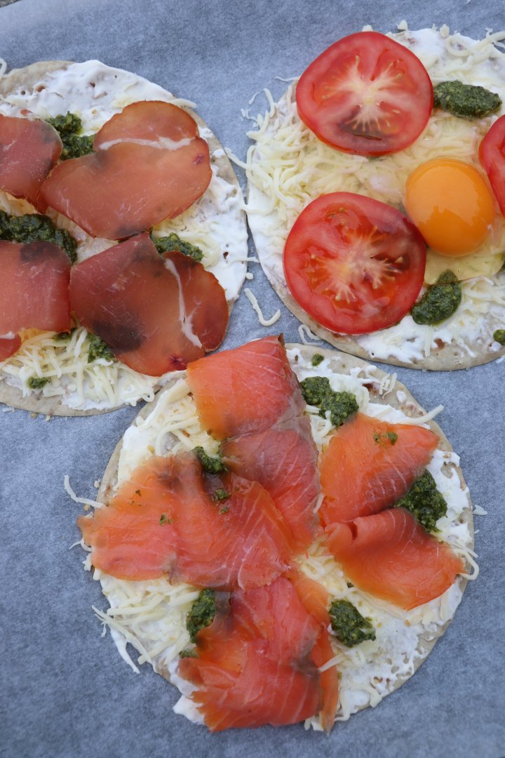 Legg på noen kladder pesto og noen skiver røkt laks eller spekeskinke. Sett inn i ovnen og stek i 10 minutter.
