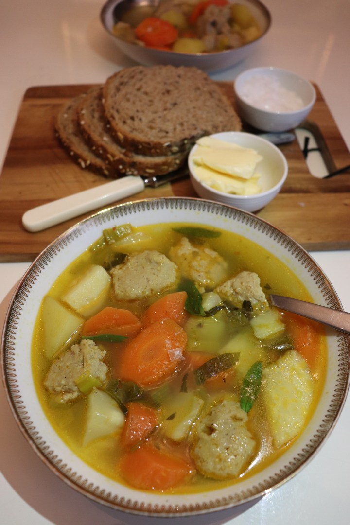 Denne grønnsakssuppa må du lage i påsken! Hva smaker vel bedre etter å ha vært ute i påskesol og frisk vårvind enn en varmende grønnsaksuppe laget på kortreist selleri fra jordet til Berit og Karl Emil, økologiske poteter fra Gro og Trond på Vestre Bjølsund og smakfulle medisterboller laget på farse fra byens egen slakter, Ertnes. Skrell, kutt, kok og nyt skikkelig god og mettende grønnsaksuppe med gode medisterboller. Hiv oppi en neve hele byggryn fra Duga som bestemora mi alltid gjorde så har du satt prikken over i’en. Det er så utrolig ukomplisert. Koketiden regulerer du på størrelsen du kutter grønnsakene i. Små biter = kort koketid. Har du dårlig tid kan du lage denne suppa på 30 minutter.
