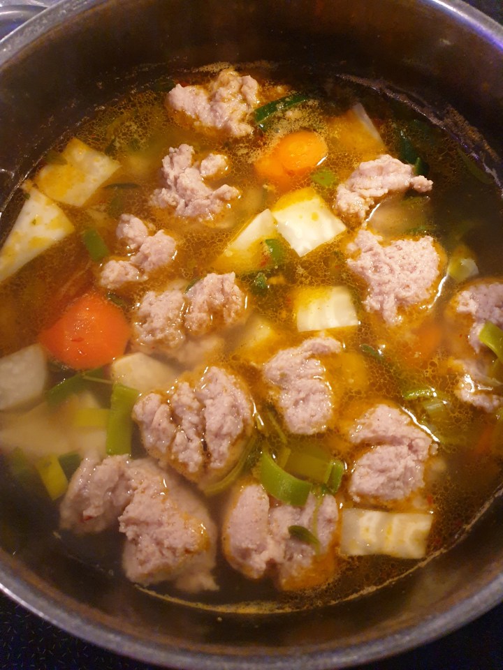 Lag små boller av farsen og legg oppi grønnsaksuppa.