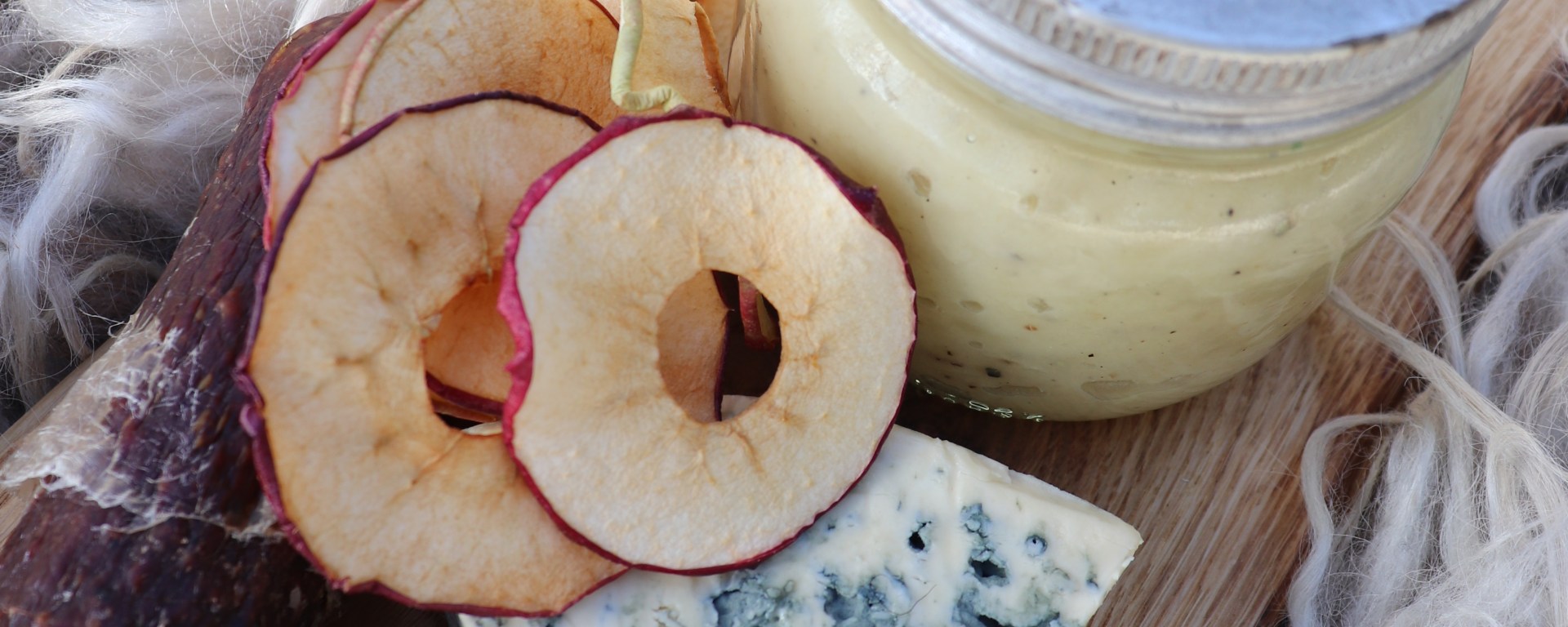 Eple-og selleripuré er både glutenfritt og laktosefritt. Friskt og syrlig tilbehør til et velassortert spekefat, og ekstra godt til fenalår. Eplesnacks fra Dyre Gård er også knallgodt og sunt tilbehør til et ostefat. Uten allergener og passer for alle.