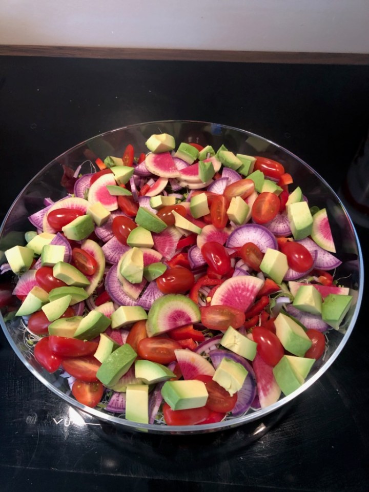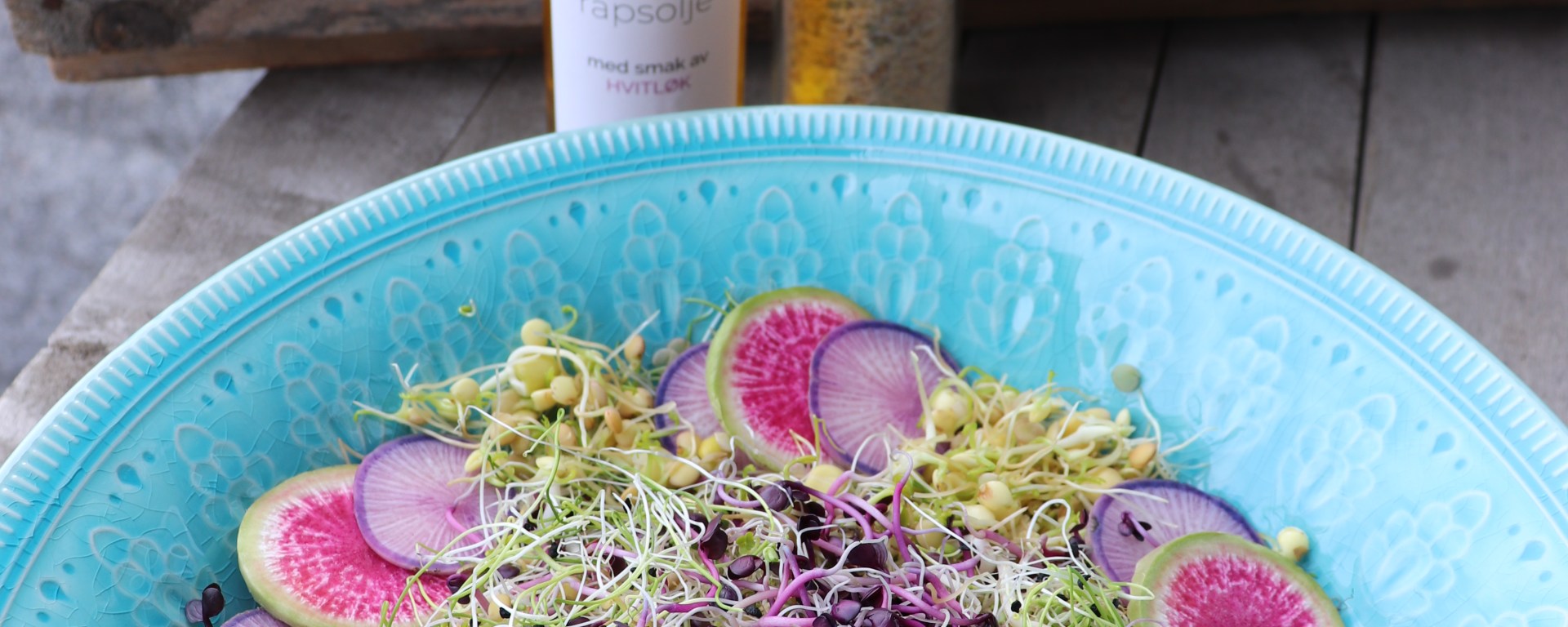 Hvis denne salaten ikke roper VÅR, vet ikke jeg!? Snakk om supersunn, næringsrik og vakker salat som du regelrett slenger sammen på et blunk. Bruk 2-3 poser av dine favorittspirer fra Spirehagen og skjær de eksotiske reddikkene fra Hasle Gård i tynne skiver. Hell over litt økologisk rapsolje fra Degernes, litt frisk sitronsaft og avslutt med å kverne over løksalt fra Rakkestads førstedame Fru Timian. Det funker med andre oljer og kryddere også, men hvorfor ikke handle lokale råvarer når vi først er så heldige å ha noen av verdens beste råvarer tilgjengelig.