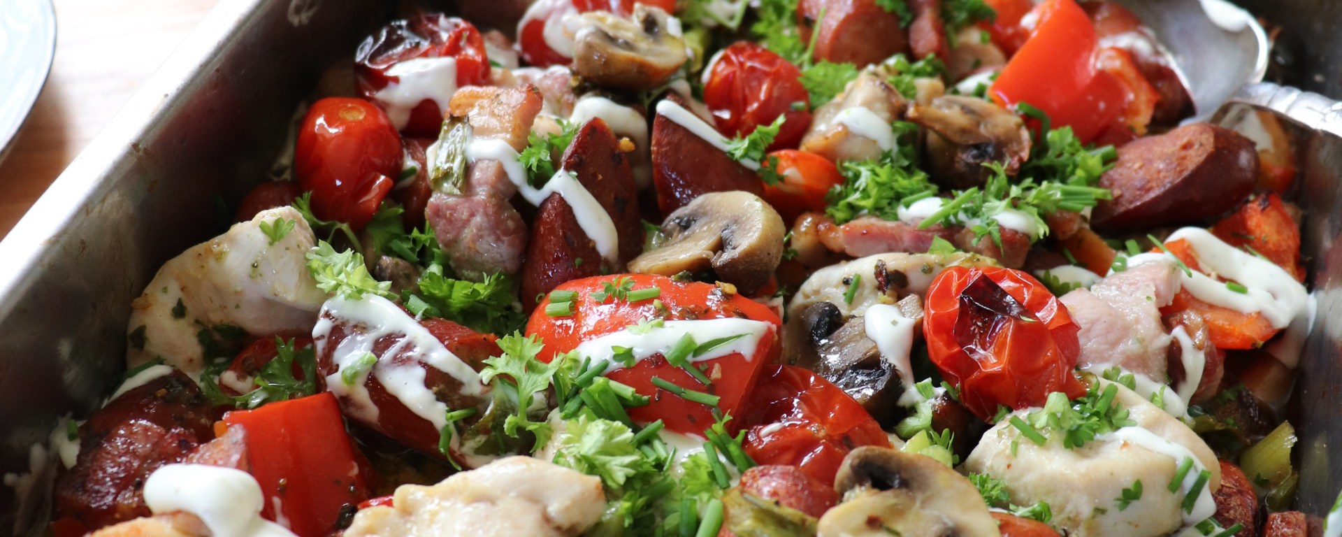 Jeg har flyttet denne uka og er derfor rimelig sliten og har hatt mininalt med tid til matlaging, ei heller kjøkkenutstyr til å lage det med. Selv med fullstendig kaos av esker, poser og 2 boliger å forholde seg til ønsker jeg å sette meg ned å spise god mat. Denne kyllingpannen med spicy pølse, bacon og grønnsaker var derfor perfekt middag i en slik setting. Alt du trenger å gjøre er å kutte råvarene i store biter (det går raskere), ha de i en ildfast form, helle over olje og strø over krydder. Stek i 20 minutter og avslutt med rømmedressing. Det beste var at middagsrestene ble til perfekte ostesmørbrød dagen derpå.