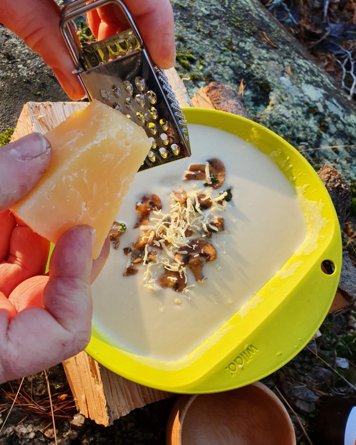 Blomkålsuppen ble spist som forrett, etterfulgt av fiskepakker stekt på bål.