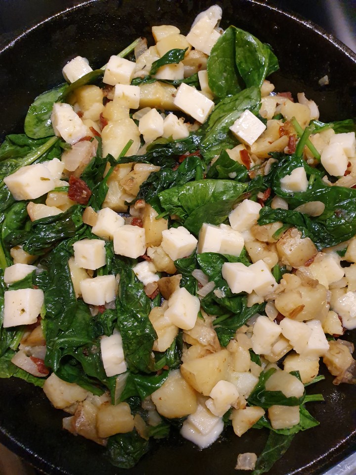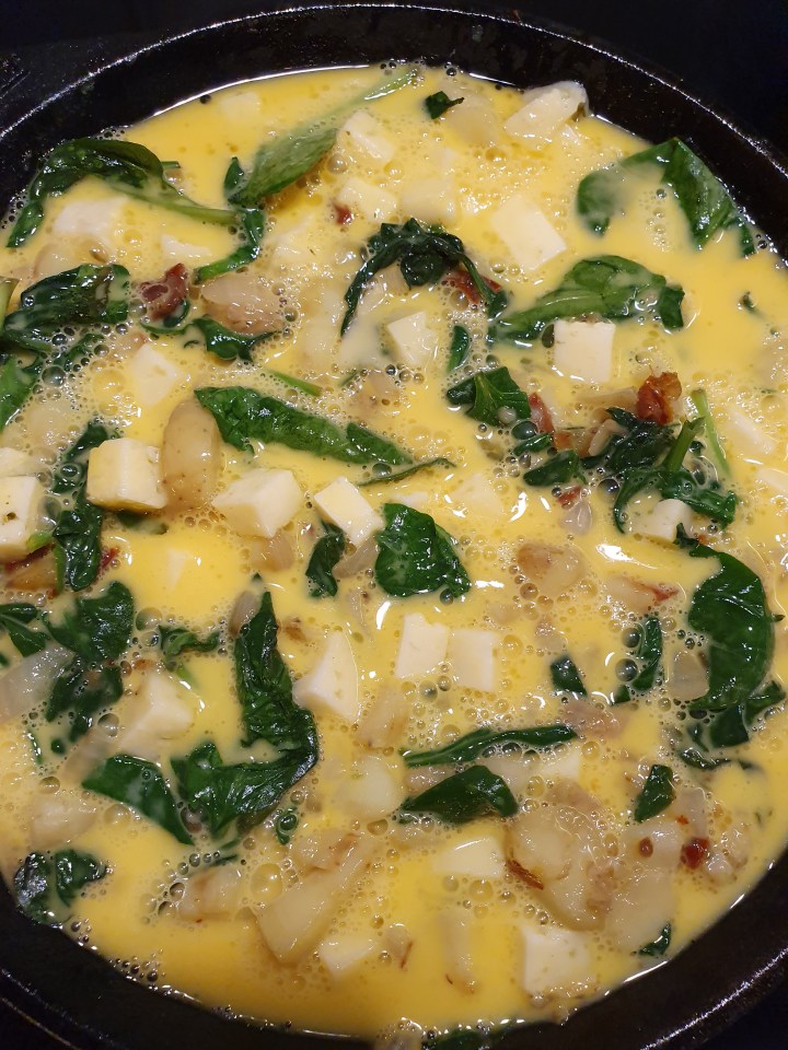 Varm litt rapsolje på middels varme i en stor stekepanne som tåler å settes inn i stekeovnen (f.eks jernpanne). Økologisk kaldpresset rapsolje inneholder mer Omega-3 fra planteriket enn olivenolje, men fettcellene omdannes til «usunt fett» over 180 grader så stek på middels varm. Legg heller på et lokk under stekeprosessen for å redusere tilberedningstiden. Gi løk og hvitløk noen minutter på å bli gjennomvarm før du har i potet, spinat og soltørka tomat. Når spinaten har «falt sammen» heller du over pisket egg og fløte.