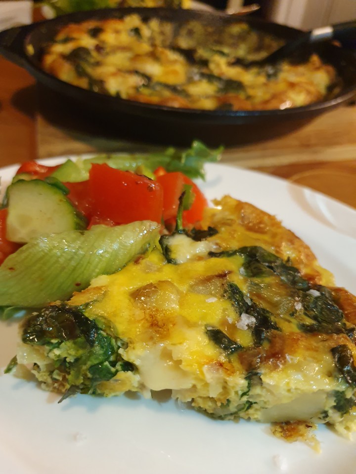 Neste gang du koker poteter til middag bør du koke noen ekstra. Det er alltid kjekt å ha noen ferdigkokte poteter i kjøleskapet. Du kan bruke de i pytt og panne, steke de som båtpoteter, spise de kalde med sild og rømme eller ha de i en enkel, smakfull og veldig rask hverdagsmiddag som denne potet- og spinat frittataen. Frittata er en italiensk omelett, ikke veldig ulik den spanske bondeomeletten tortilla. Siden potetene allerede er kokt er det veldig enkelt og raskt å lage denne retten som er like fin til lunch som til middag. Fyll den med sunn spinat, soltørka tomat, løk, hvitløk og ost. Du kan selvfølgelig også bruke bacon, spekesinke eller røkt laks, men denne kjøttfrie varianten smaker helt nydelig uten.
