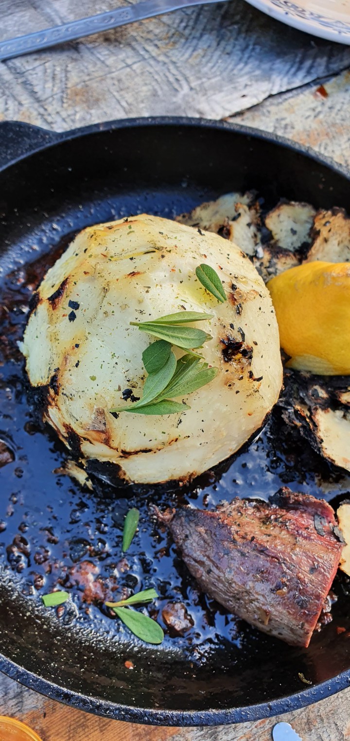 Før servering skjærer du bort det brente skallet og heller over litt sitronsaft og hvitløksolje.