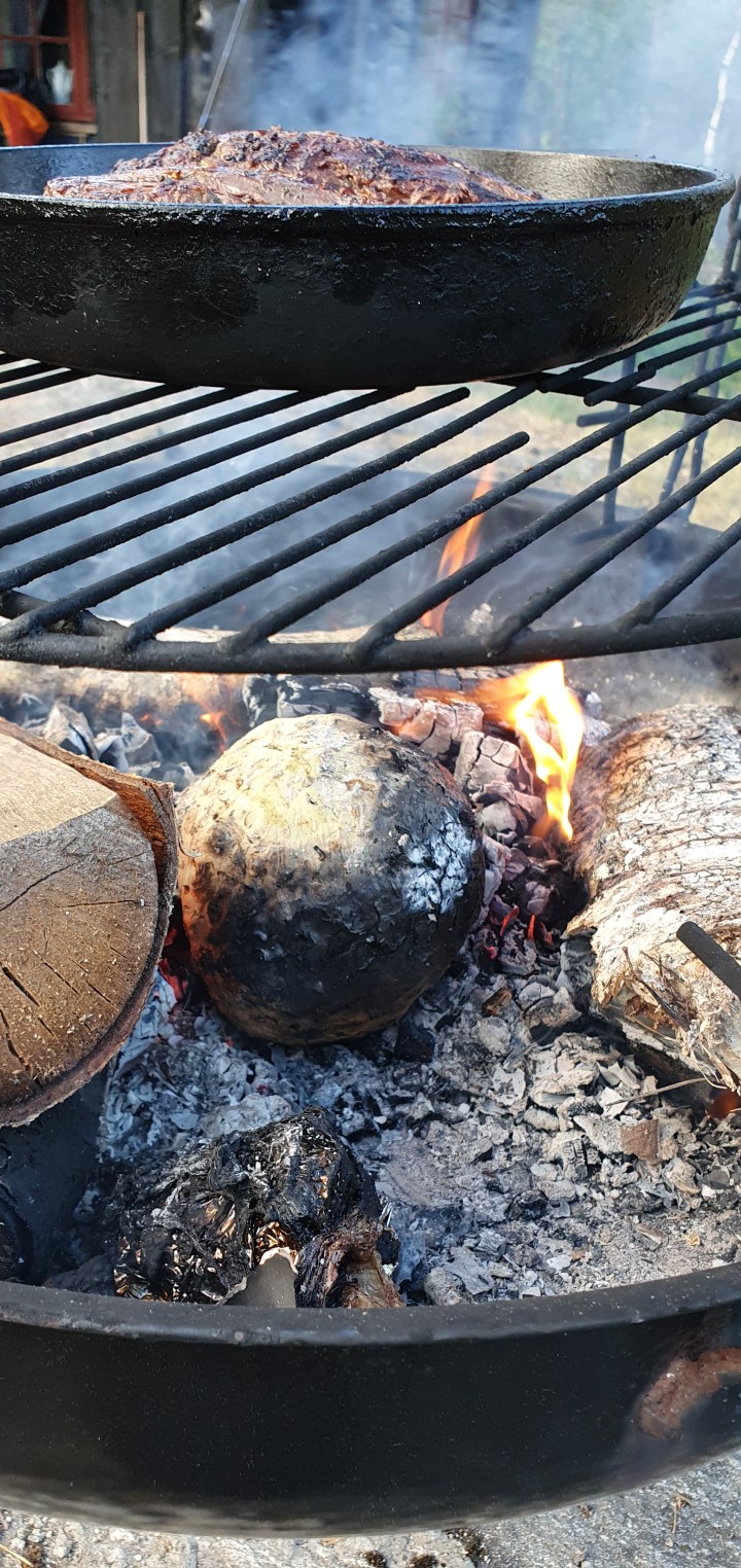 Legg sellerirota rett på brennende kull UTEN å vaske eller skrelle den. Sellerirota trenger ca 30-40 minutter på å bli gjennomvarm. Snu den ofte.