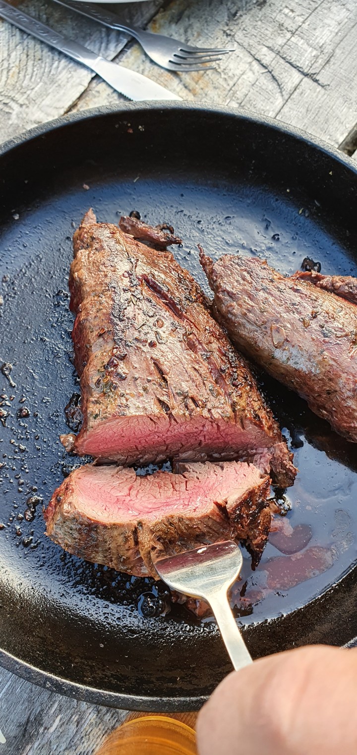 La kjøttet hvile før du deler det opp. PS: dette blogginnlegget handler egentlig ikke om å grille den perfekte elgfileten, men om pors poteter og bakt sellerirot.