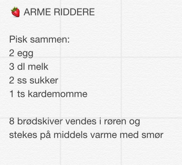 Nå som innhøstingen er i full gang er det deilig å lage nyrørt syltetøy for å ha på brødskiva. Arme riddere er en strålende måte å bruke opp tørt og gammelt brød på. Vend brødskiver i eggeblanding med smak av kardemomme og vanilje og stek skivene på begge sider i ei stekepanne med smør. Perfekt frokost på langsomme helgedager, til lunch eller som dessert med friske bær og gjerne en kladd vaniljekesam.