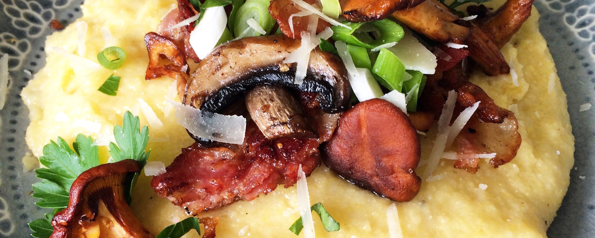 Polenta er en gluten- og laktosefri maisgrøt kokt på hønsebuljong med parmesan. Den lages på 3 minutter og kan serveres med tilbehør etter eget ønske. Siden skogen glitrer av gull om dagen valgte jeg å servere med kantarell og annen sopp, sprøstekt bacon og revet parmesan. Denne smakfulle retten er sunn og rask å tilberede.