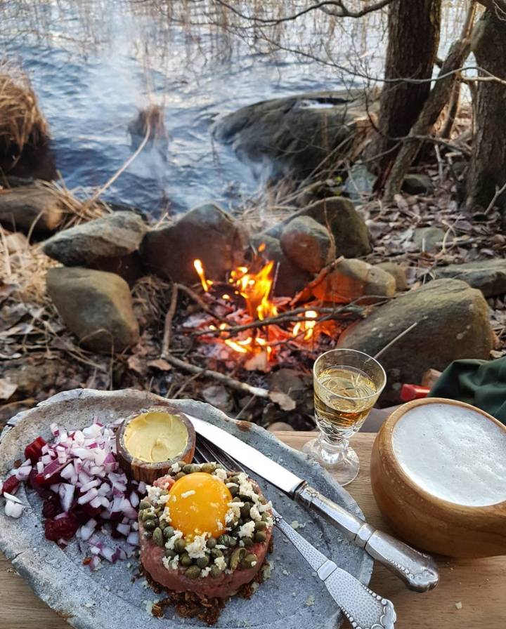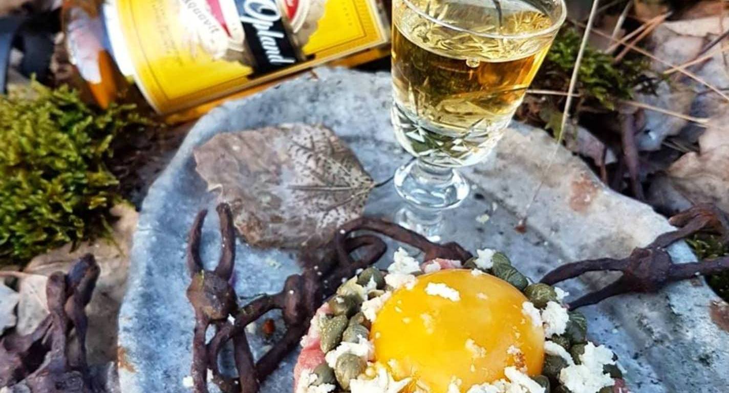 Server tartaren med finhakket rødløk, rødbet og dijon sennep. Tartar smaker veldig godt sammen med akevitt og øl. Ønsker du en mild og fin akevitt anbefaler jeg «Gammel Opland».