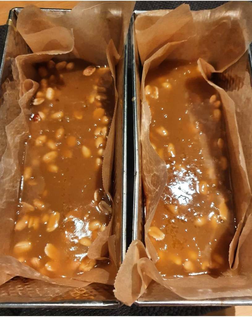 Finn frem en liten brødform og dekk med bakepapir. Hell et lag peanøtter i bunnen og strø over flaksalt.