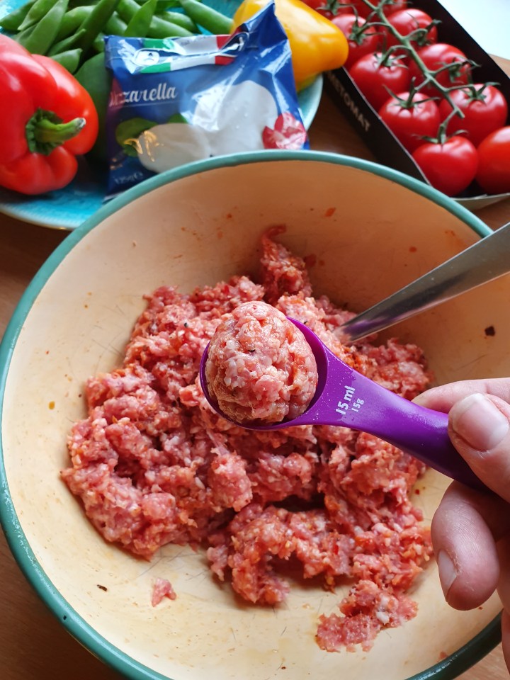 Bruk en barneskje eller liten måleskje til å forme tapasboller. Jeg kjøpte et sett måleskjeer på TGR til 19,- 😎