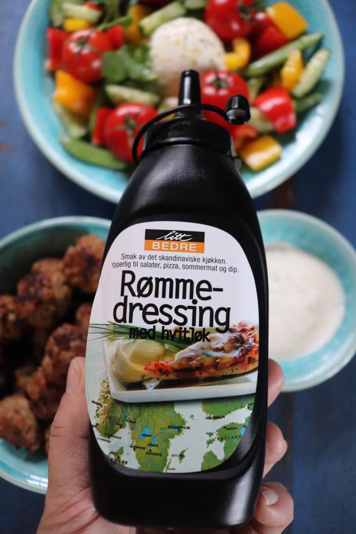 I mellomtiden fikser du tilbehøret. Denne gangen ble det friske grønnsaker, mozzarella og rømmedressing fra Gourmetcompagniet.