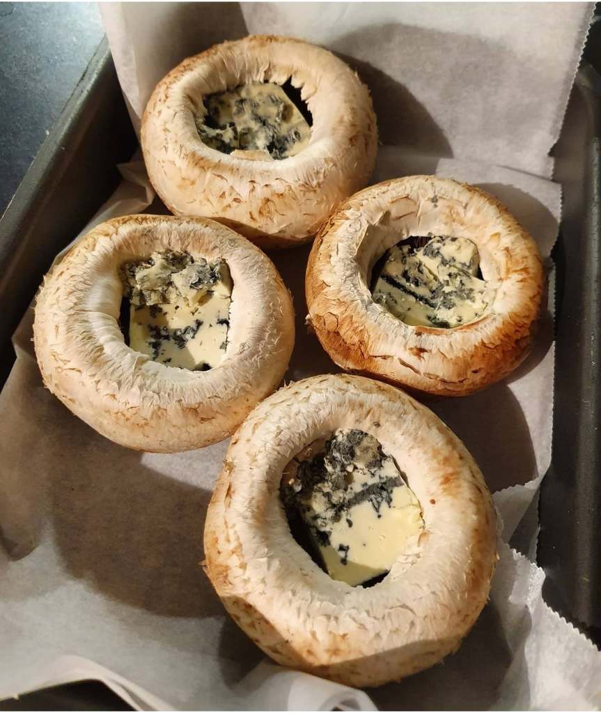 Skjær en bit blåskimmelost og legg i bunnen av soppen. Du kan i prinsippet bruke all slags ost, men ikke vær redd for å gå for en blåskimmelost med mye smak. Soppen rommer tross alt ikke så mye stuffing og de skal bare fylles med bacon og ost. Pensle soppen med en god olje. Jeg elsker den økologiske hvitløksoljen til RO som passer til alt og er magevennlig.