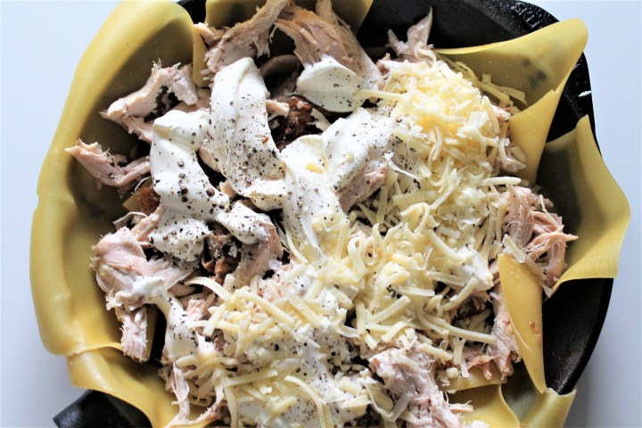 Legg et nytt lag med lasagneplater, kyllingbiter, creme fraiche, salt og pepper. Avslutt med et godt lag revet ost på toppen.