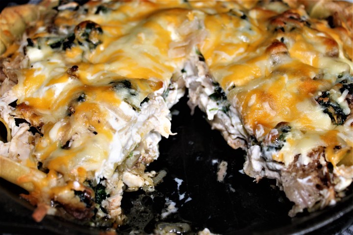 Du skal nå ha et lag med kylling i bunnen, et lag med kylling og spinatblanding i midten og et lag med kylling øverst.
