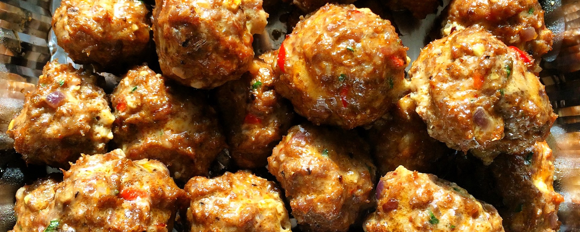 Disse kjøttbollene er saftige og smakfulle av lune krydder, friske urter og bacon. Du blander farsen kjapt i en kjøkkenmaskin og lager små boller med teskje som du steker i ovnen i 12 minutter. Bruk kjøttdeig av okse, lam, kylling eller svin.