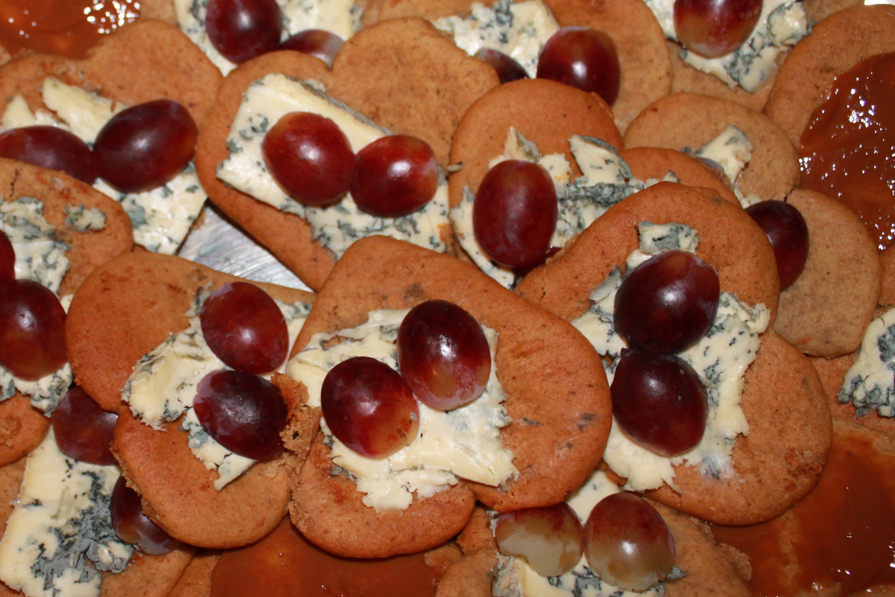 Pepperkaker med blåskimmelost og røde druer er bare vanvittig godt og en genial måte å ønske dine gjester velkommen på. Har du veldig dårlig tid er det lov å jukse med kjøpte pepperkaker og blåmuggost på tube. Et godt alternativ til de som ikke liker muggost er Hapå. Høres rart ut, men er ille godt 🙂