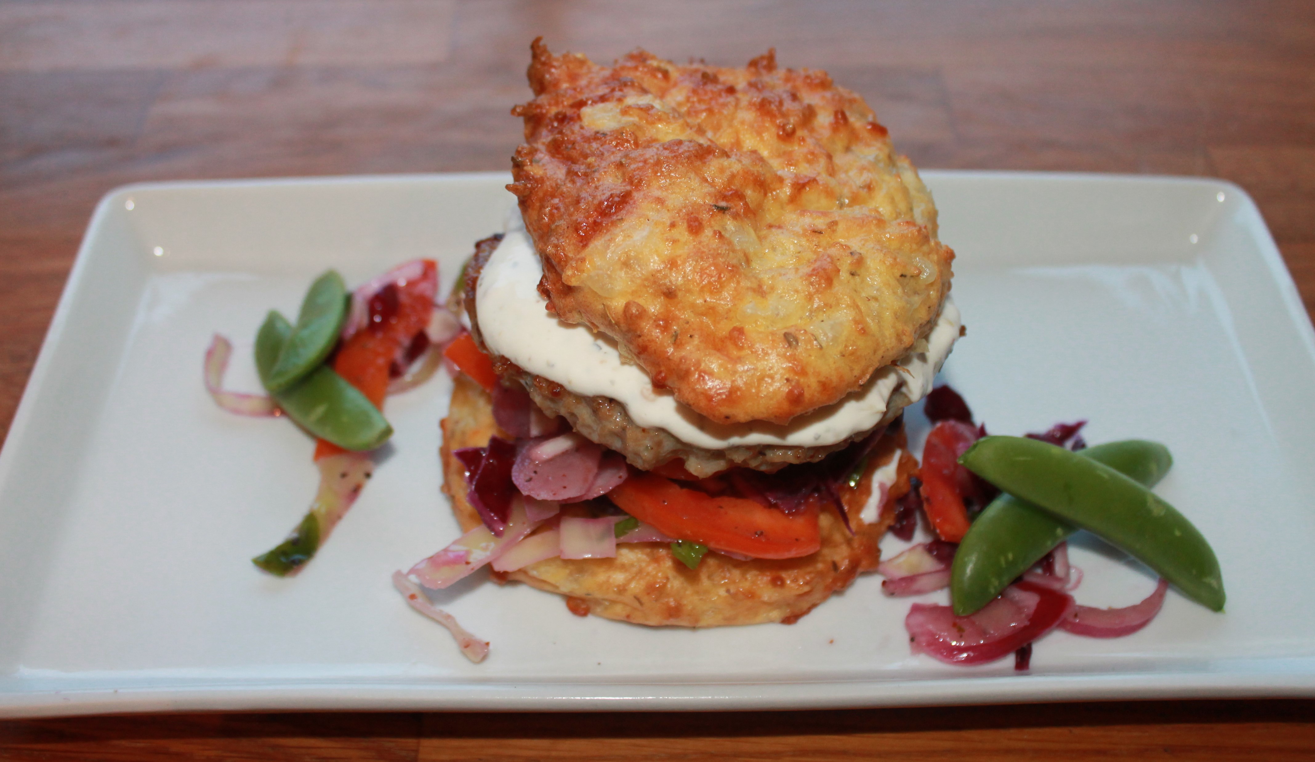 Når det først er OL må det være lov å innta middagen foran TV! I sportens og sunnhetens ånd lagde jeg en kyllingburger med frisk råkostsalat, hvitløksdressing og sunne hamburgerbrød, eller ostplätter som de heter i lavkarboverden.