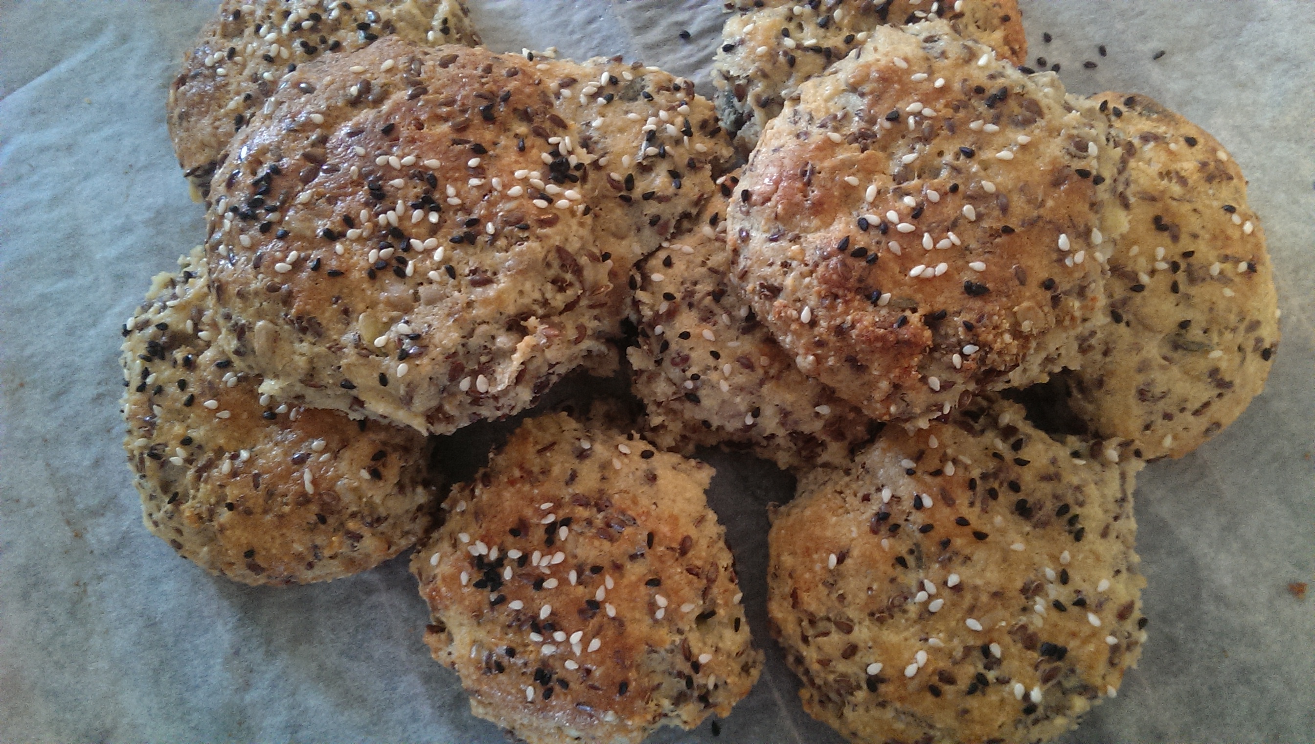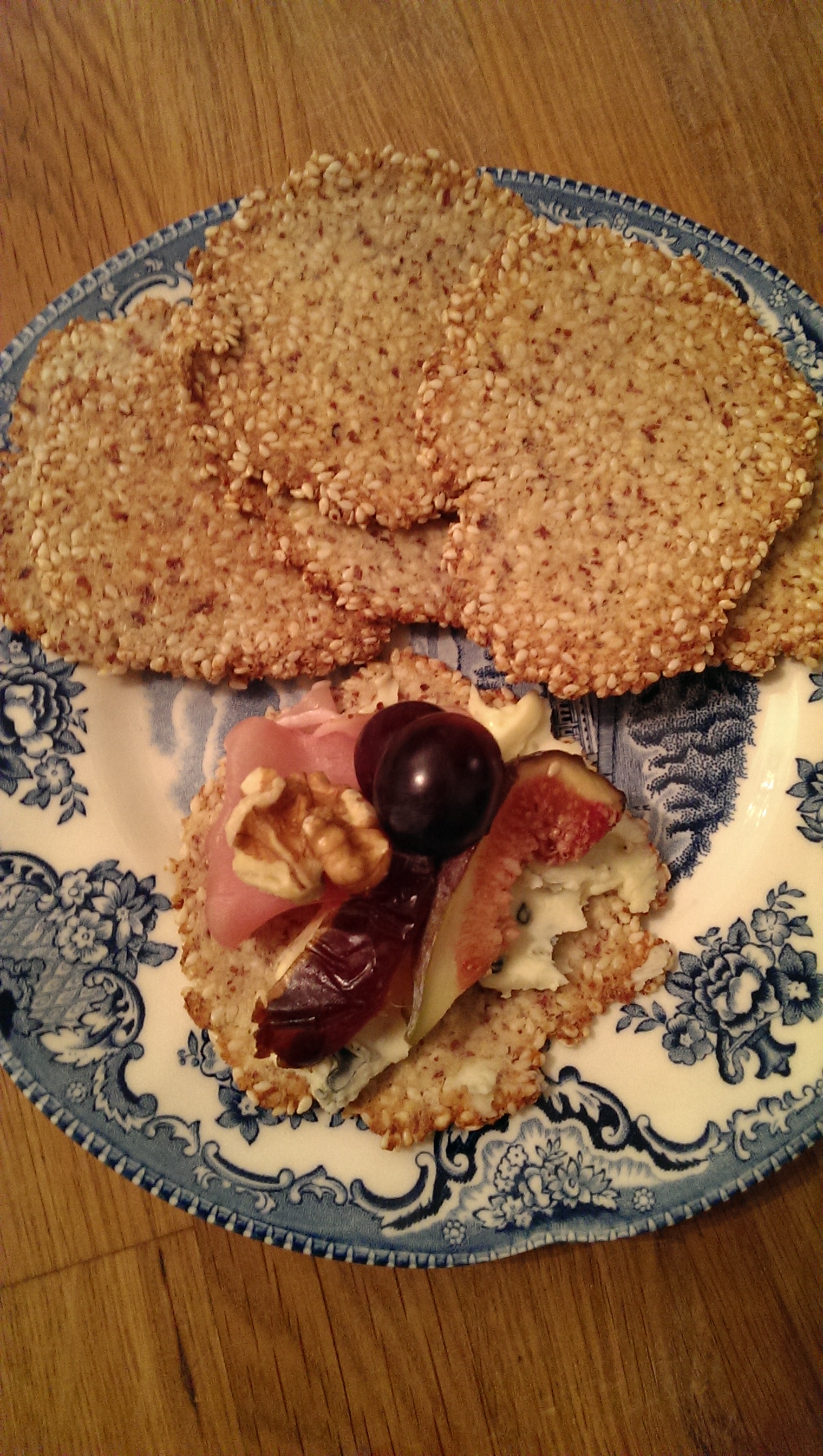screenshot_20170106-115107Jeg ble litt lei av mørke knekkebrød som skal steke 1 time i ovnen så jeg rørte sammen en glutenfri blanding av lyst sesammel, sesamfrø, gresskar- og solsikkekjerner og bokhvete flak. 25 minutter senere var resultatet 2 langpanner med sprø og gode knekkebrød. Du kan bytte ut bokhvete flakene med glutenfrie havregryn og du kan tilsette tørkede urter for mer smak. Disse knekkebrødene er perfekte å bytte ut flatbrødet med og de tåler å bli smurt på uten at de knekker.