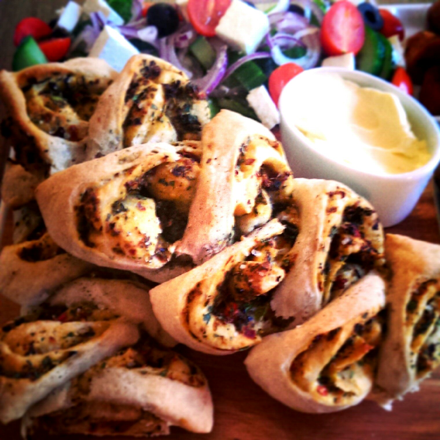 Jeg fikk besøk av en god venninne i går og ville sette frem noe annet enn potetgull og sjokolade.  Jeg tok det jeg fant i kjøleskapet og snekret sammen disse. Hadde egentlig en plan om å bruke mozzarella og basilikum, men mozzarellaen hadde gått ut i oktober 2013.. Denne varianten ble overraskende bra!