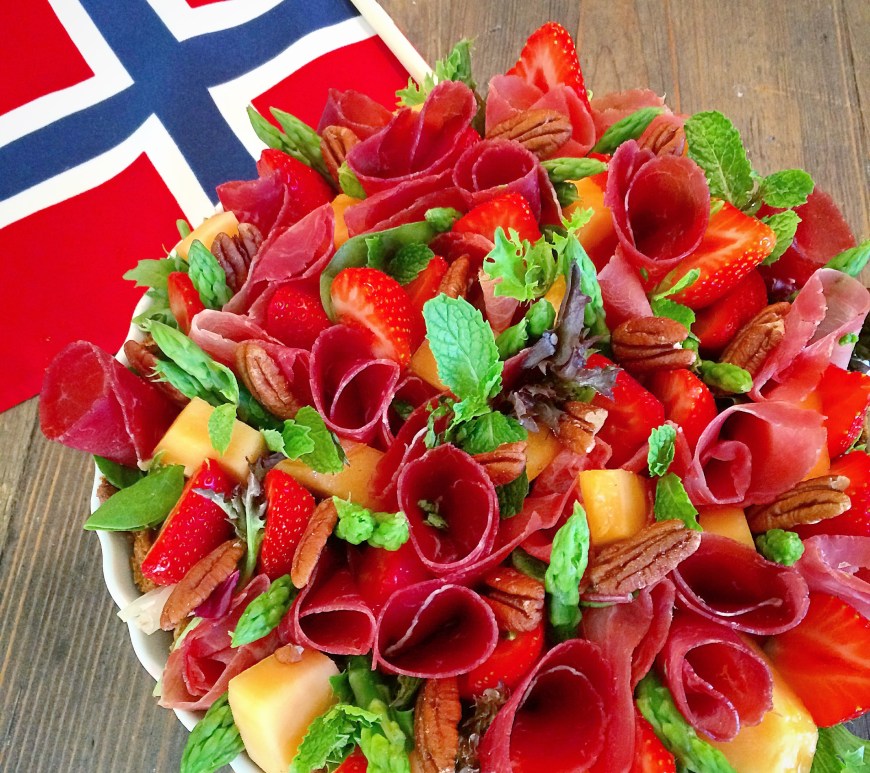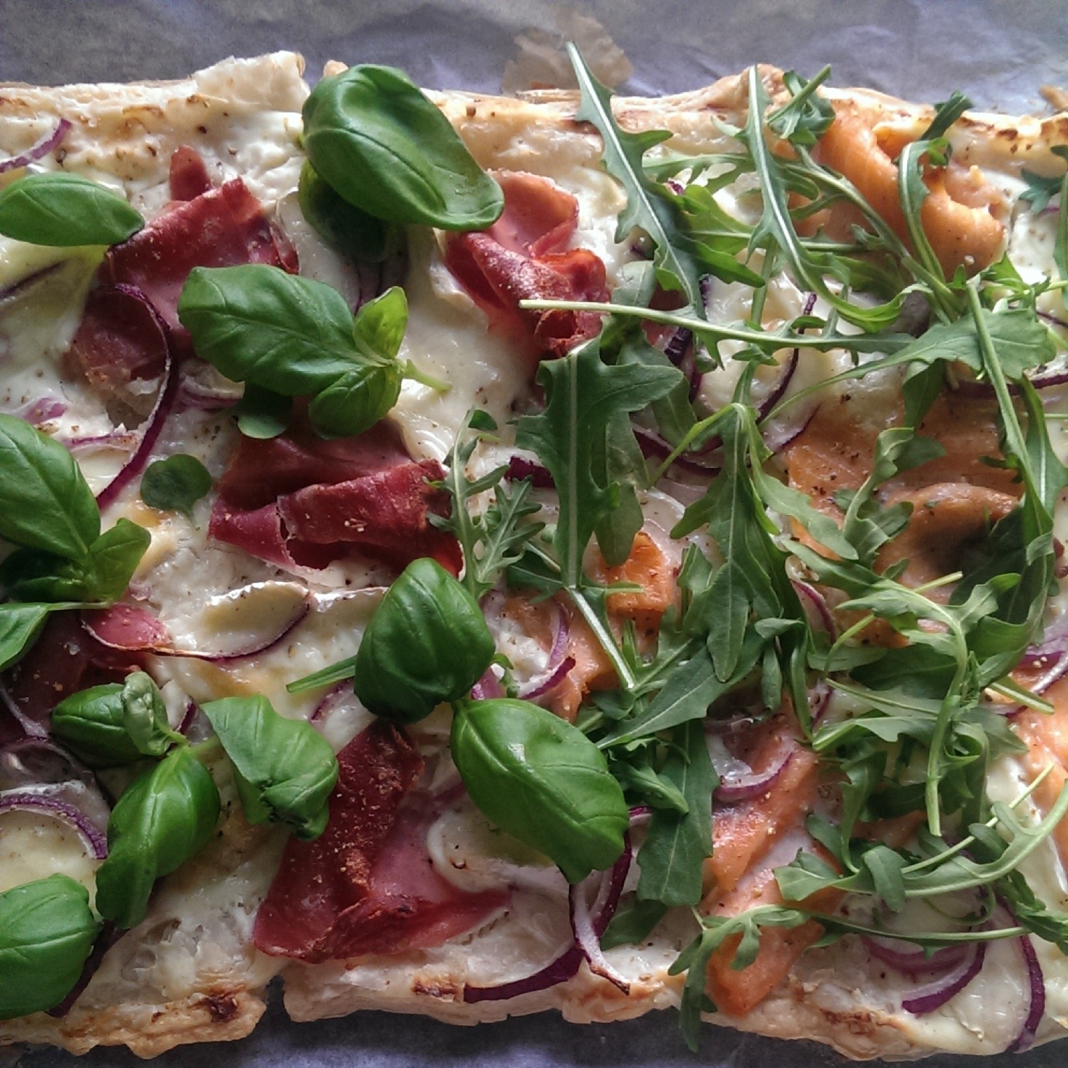 Den ene halvdelene er med smakfull laks og ruccola og den andre halvdelen er med salt spekeskinke og basilikum.