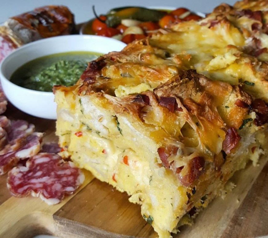 Screenshot_20170404-110950Dette er nøkkelen til suksess for enhver lunch eller koldtbord. Med denne fremgangsmåten kan absolutt alle lykkes med å servere rykende ferskt, smakfullt, høyt og «hjemmebakt» brød. Det aller beste med denne fremgangsmåten er at du setter det sammen dagen før, oppbevarer det i kjøleskapet over natten og steker det mens du dekker på til gjester dagen etter. Her tar du rett og slett og skjærer et kjøpabrød i terninger, legger det i form og heller over en eggeblanding med chili, hvitløk, persille, revet ost og strimlet spekeskinke. Over natten vil eggeblandingen trekke seg inn i brødet og når du tar det ut av ovnen ser det ut som et helt vanlig nystekt brød med masse deilig smak og snadder i. Så enkelt og så vanvittig smakfullt at du bør kanskje lage 2. Server gjerne med en pesto, litt spekemat og ovnsbakte tomater til. Dette brødet kommer til å gå som varmt hvetebrød.