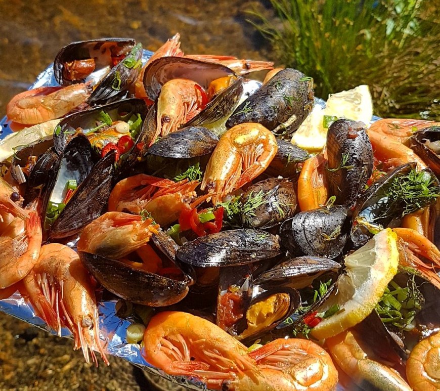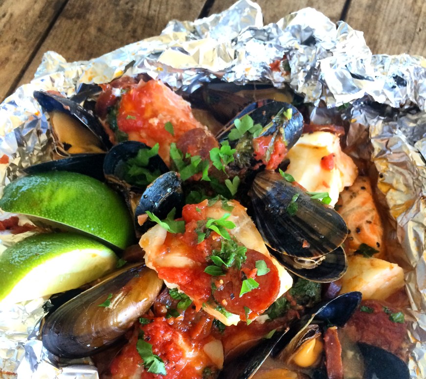 Foliegrillet fiskepakke med chorizo og blåskjell