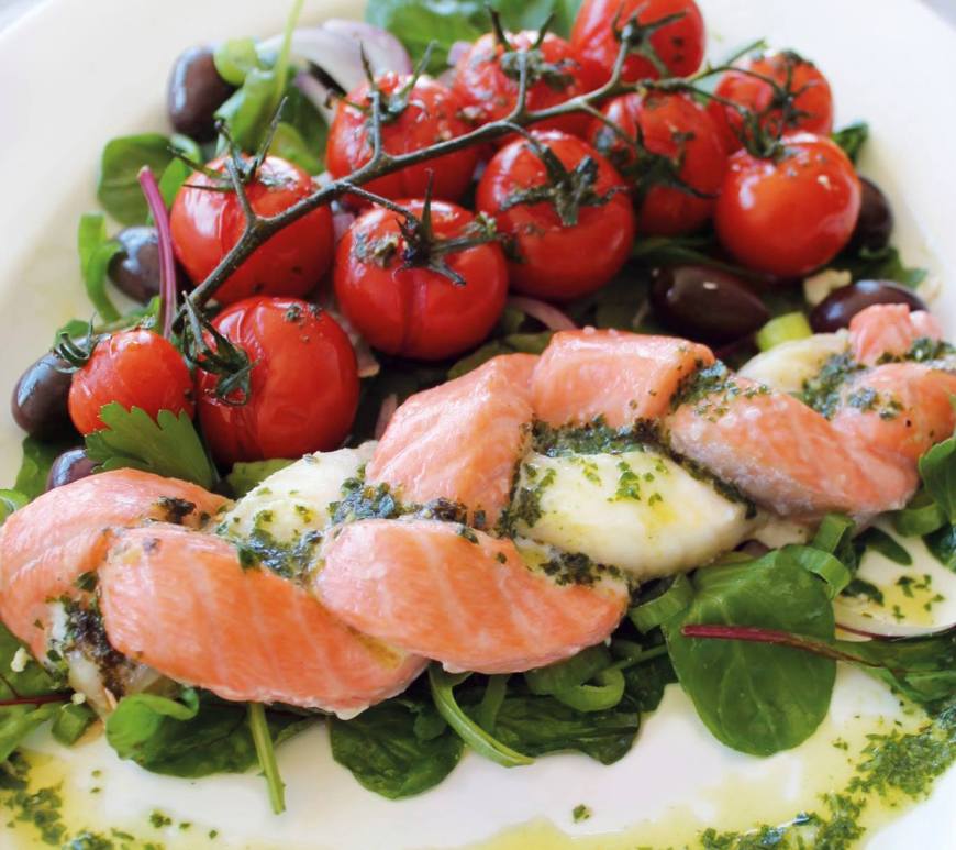 Flettet steinbit og laks stekt i ovnen med persilleolje er en enkel, men litt spennende måte å servere fisken på. Fiskekjøttet skjæres i tynne strimler og flettes på vanlig måte hvor man kan variere med 3 eller 4 strimler for å skape forskjellig mønster med ulike fisketyper. Her serveres fisken med en enkel og sunn salat av ovnsbakte smakstomater og oliven med en kald persilleolje til dressing.