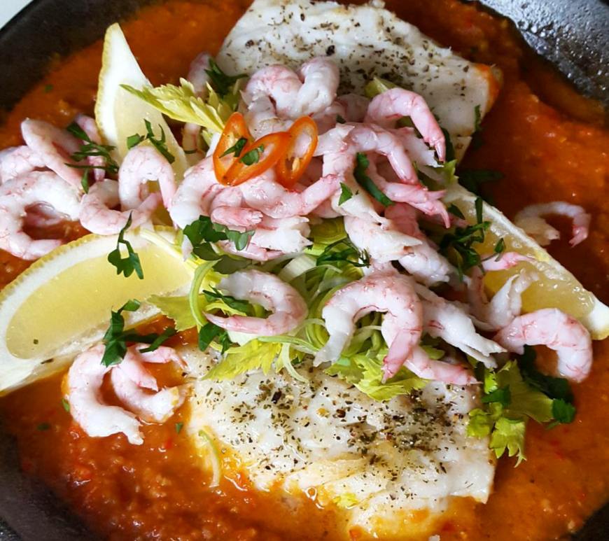 Slik lager du denne raske fiskemiddagen til 3-4 personer: Fortsett å lese «Torsk og scampi i tomatpesto og ratatoui»
