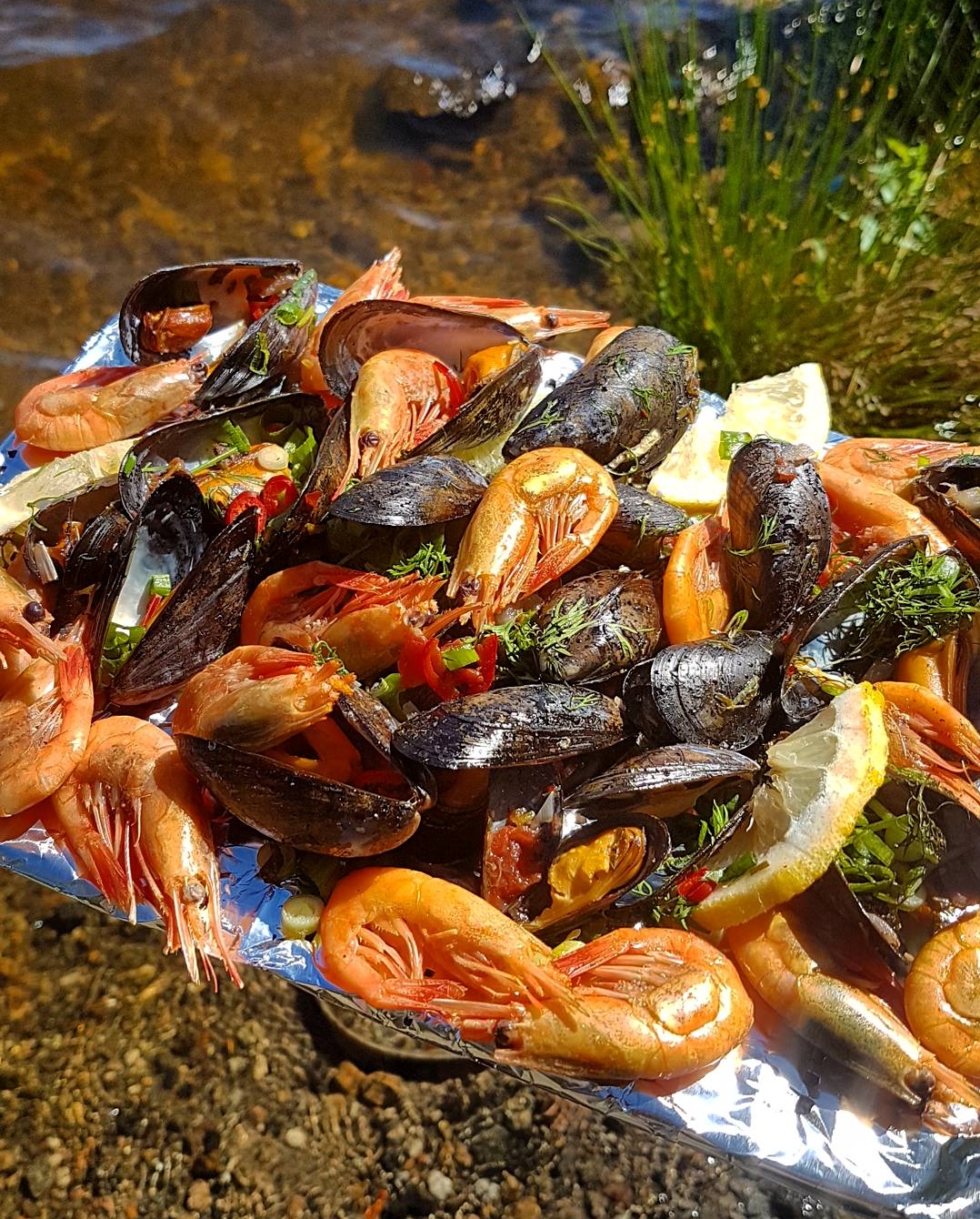 Dette er en skikkelig snadder fiskemiddag med laks, steinbit, isgalte og blåskjell.