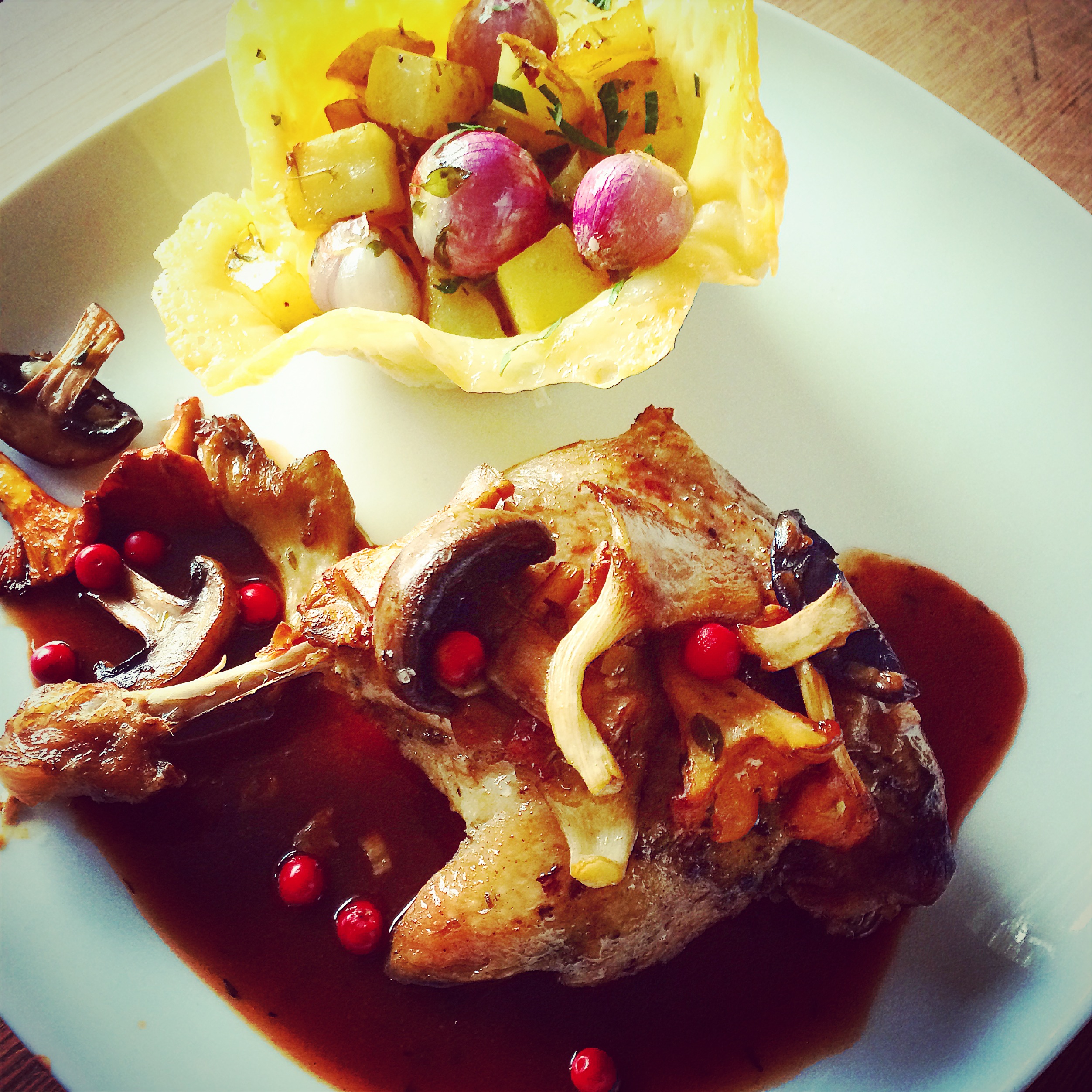 Det er ikke bare lam som er typisk påskemat. And, høne, gås og annen fugl står ofte på påskemenyen. Confitering er en av de eldste konserverings-metodene som innebærer at kjøtt skal koke i sitt eget fett. Det er vanvittig enkelt å lage selv og blir garantert mørt og saftig! Andelår saltes på forhånd og kokes i andefett på svak varme over lang tid. Snikgjest selger både andelår og andefett fra Holte Gård , men denne gangen brukte jeg usaltet meierismør til confiteringen. Jeg smaksatte med hele hvitløksfedd og fersk rosmarin. 6 timer på 120 grader gjorde at kjøttet falt av beinet og smakte himmelsk. Kokte poteter, sopp og purre fikk et raskt fres i panna med confiteringsfettet sammen med litt ramsløksalt. Når tenåringen takker for maten ved å si «Mamma, you have holy gift» kan man si seg godt fornøyd med måltidet. Kanskje har du noe selvskutt fugl eller hare i fryseren du kan confitere og servere med en god jakthistorie. Blir det mat til overs legger du kjøtt og fett på glass og oppbevarer det i kjøleskap eller en kjølig kjeller.