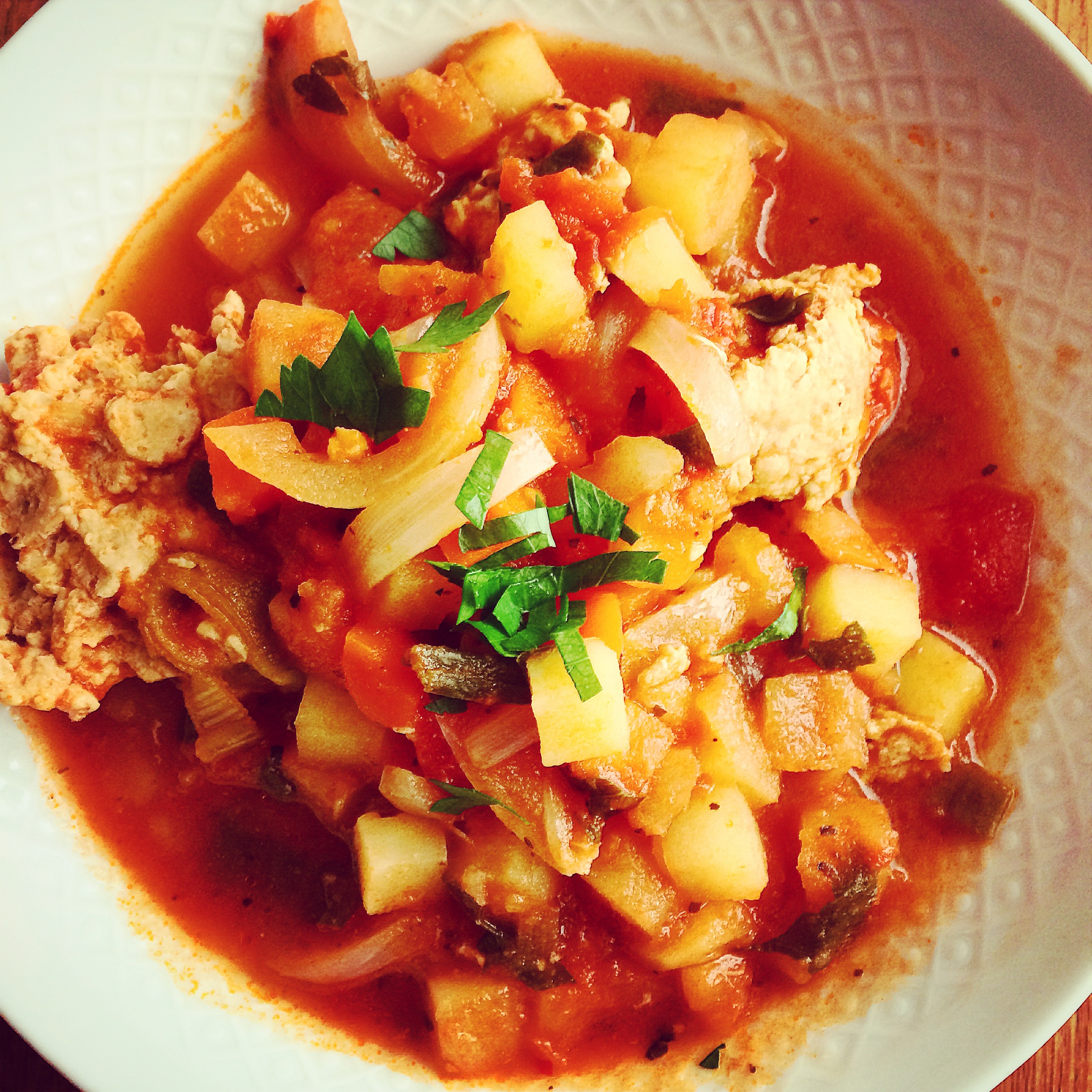Arrabiata betyr «sint» på italiensk. Sint som i chiliHOT. Du kan selvfølgelig regulere styrken på suppen selv, men du bør minimum spandere 2 chili på denne. Grønnsaksuppen er super enkel å lage ved hjelp av en kjøkkenmaskin. Du finhakker nemlig 80 % av grønnsakene i foodmixeren først og tilsetter hønsebuljong, bokstomat, tomatpurè og litt krydder. Gulrot skjæres i tynne skiver og kålen i små biter.