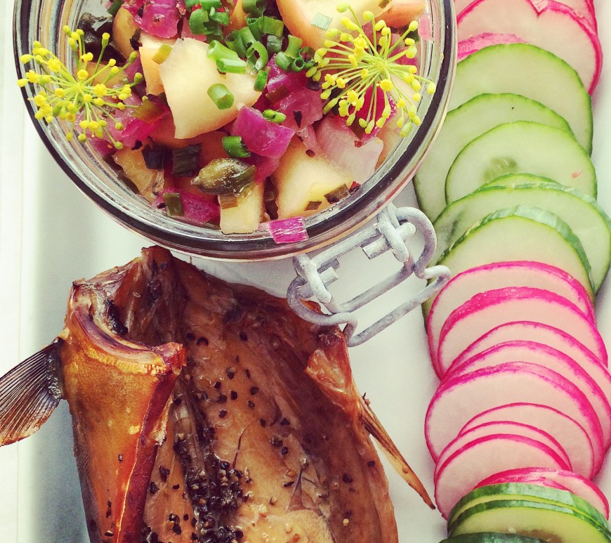 Sunnere og enklere går det nesten ikke an å få blitt. Rå salma med frisk og syrlig salat av eple, rødløk, gressløk, limesaft og olivenolje. For å få fart i smaksløkene har jeg tilsatt litt salt, sukker og eddik. Kjapt å slenge sammen og helt nydelig å spise. Her bugner det av deilig og frisk smak.
