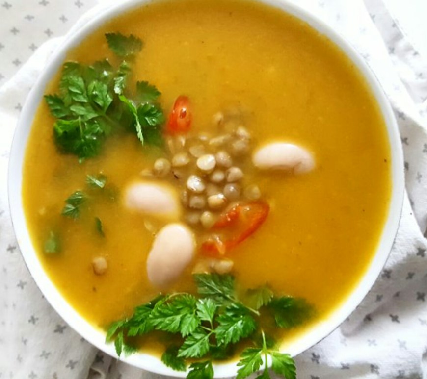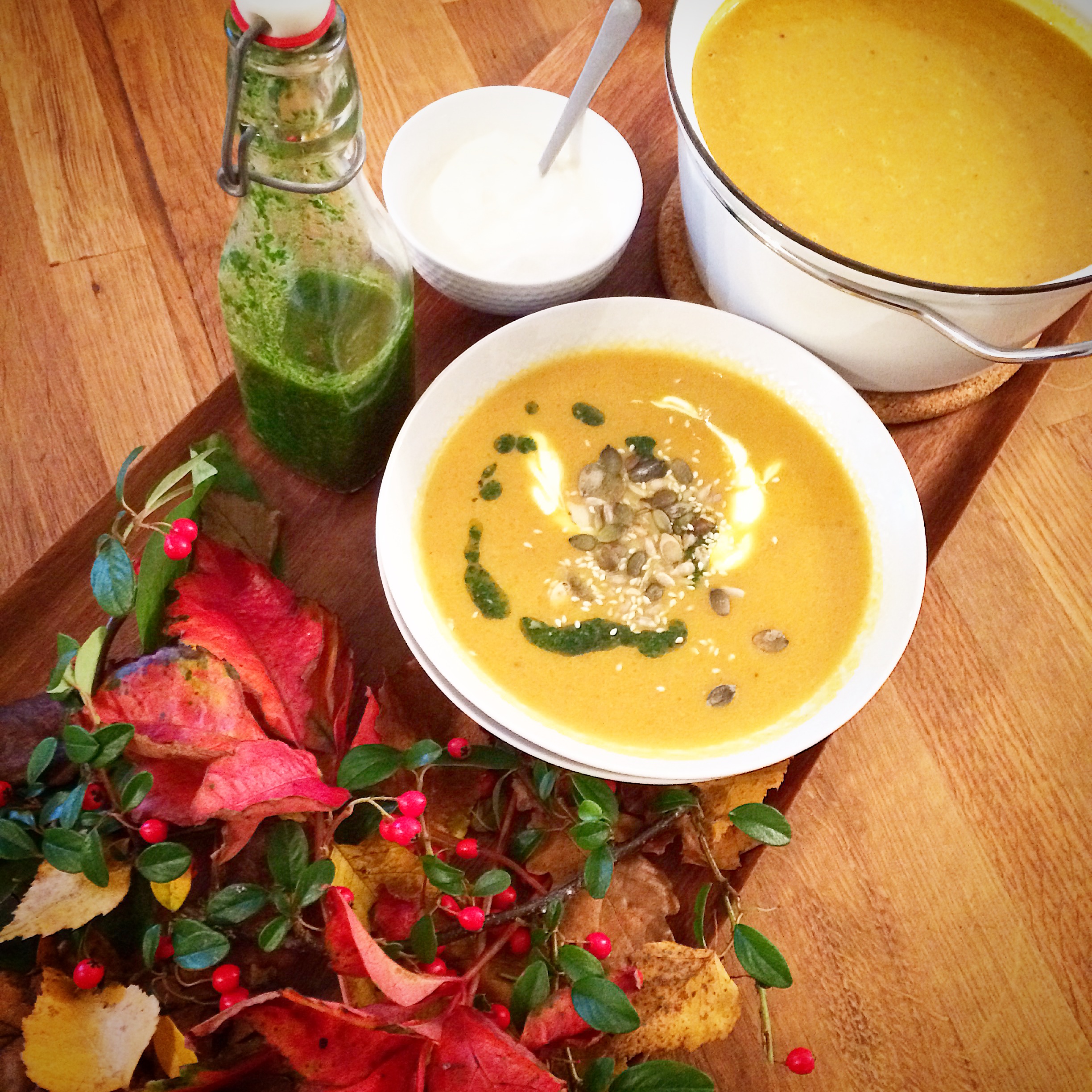 Som oftest blir veien til mens man går og matretter til under koking. Ja, det sier seg jo selv.. Denne deilige suppen ble annerledes enn jeg hadde tenkt. Den ble bedre og enklere! Hemmeligheten ligger i simringa av gresskar i biter med hvitløk, løk, chili, revet ingefær og ganske mye tandoori masala. Når disse ingrediensene får velte seg i dette deilige krydderet sprer fantastiske lukter seg i hele huset og danner basen til en veldig god og sunn gresskarsuppe. Jeg droppet kokosmelken og fløten og brukte kun hønsebuljong slik at tandorismaken skulle bli enda tydeligere. Helt på slutten tilsatte jeg ferdigkokte linser og bønner.