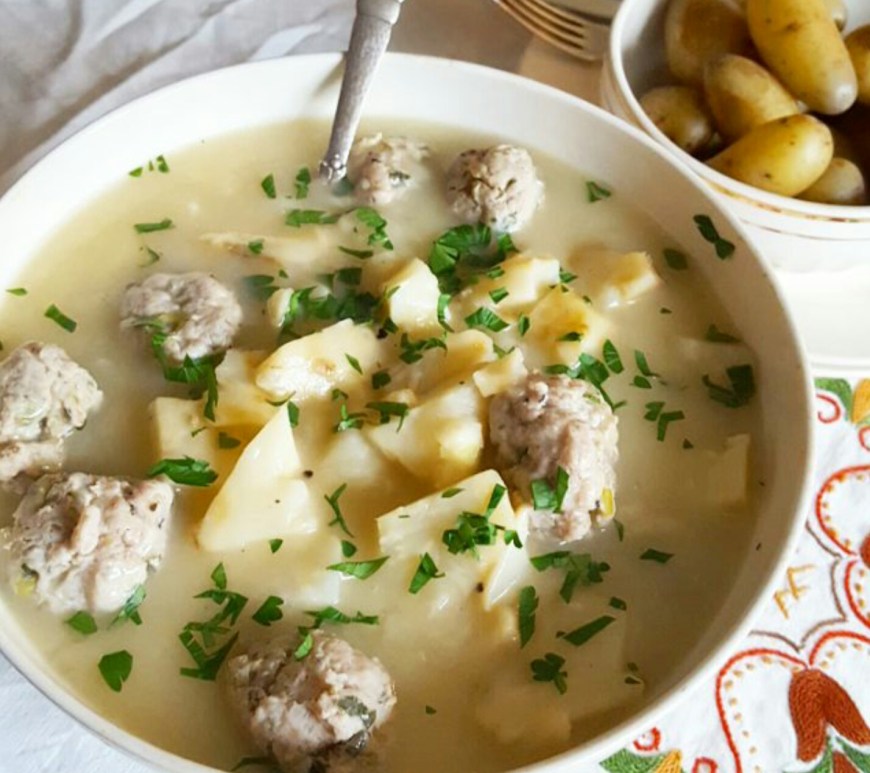 Denne grønnsakssuppa må du lage i påsken! Hva smaker vel bedre etter å ha vært ute i påskesol og frisk vårvind enn en varmende grønnsaksuppe laget på kortreist selleri fra jordet til Berit og Karl Emil, økologiske poteter fra Gro og Trond på Vestre Bjølsund og smakfulle medisterboller laget på farse fra byens egen slakter, Ertnes. Skrell, kutt, kok og nyt skikkelig god og mettende grønnsaksuppe med gode medisterboller. Hiv oppi en neve hele byggryn fra Duga som bestemora mi alltid gjorde så har du satt prikken over i’en. Det er så utrolig ukomplisert. Koketiden regulerer du på størrelsen du kutter grønnsakene i. Små biter = kort koketid. Har du dårlig tid kan du lage denne suppa på 30 minutter.