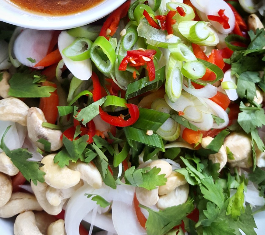 Denne thai salaten er et fyrverkeri av gode smaker. Salaten er rask å tilberede ved å strimle alle ingrediensene tynt og helle over en rask sammenvispet thailandsk dressing.
