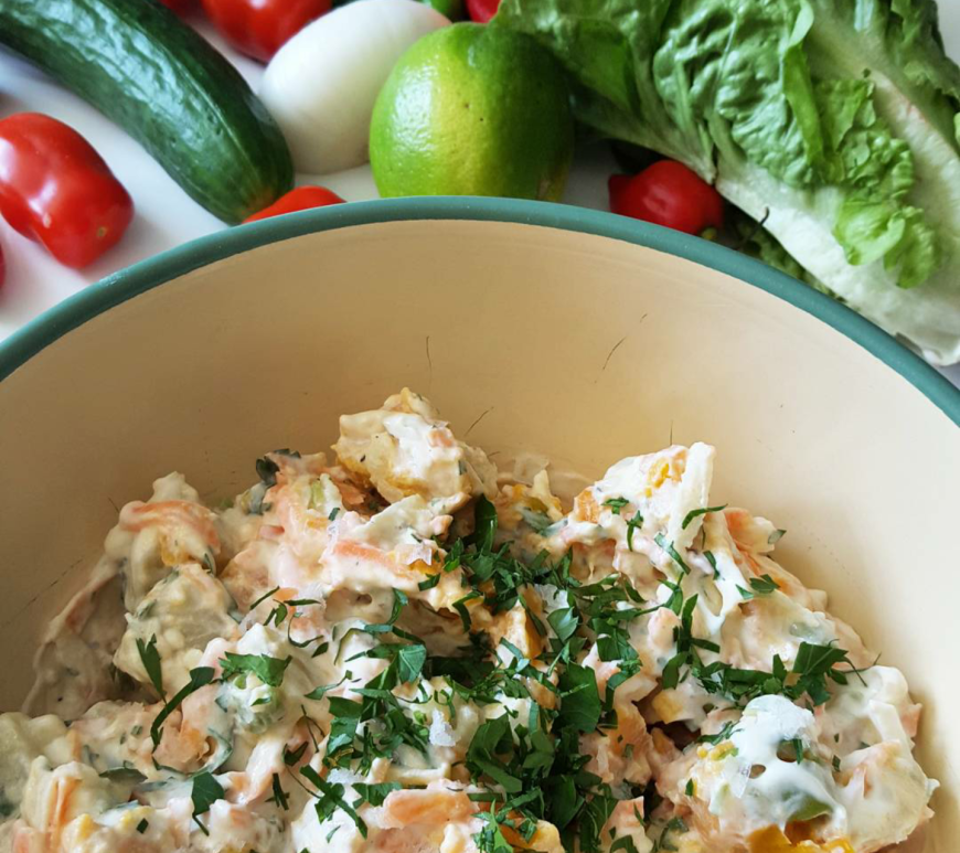 Du trenger ikke mange ingredienser for å lage en skikkelig god og sunn potetsalat dersom du bruker det aller beste av tilgjengelige råvarer. Her i Østfold bor vi midt i matfatet og Snikgjest vet å sette pris på det! Økologisk småpotet fra Vestre Bjølsund i Rygge er nydelige på smak. De smaker like godt kalde og med skallet på. Faktisk er de sunnere da. Du beholder flere næringsstoffer under koking og kokte, kalde poteter har mindre lett fordøyelig stivelse enn varme poteter og derfor mindre påvirkning på blodsukkeret. Årets smakfulle poteter toppes med deilig dressing laget på RO økologisk rapsolje med hvitløk fra Degernes + ramsløksaltet til Fru Timian i Rakkestad og limeeddik. Rapsoljen er kaldpresset og inneholder mer omega 3 enn olivenolje og kan spises dersom man har en sensitiv tarm og ikke tåler vanlig hvitløk/løk. Topp med finsnittet purre og persille. Koker du potetene kvelden før mens du ligger lettere henslengt på sofaen og ser på TV, tar den potetsalaten nøyaktig 1 minutt å lage. Perfekt tilbehør til røkt laks/ørret, spekemat, skalldyr og til alle som ikke orker majonesete potetsalater.