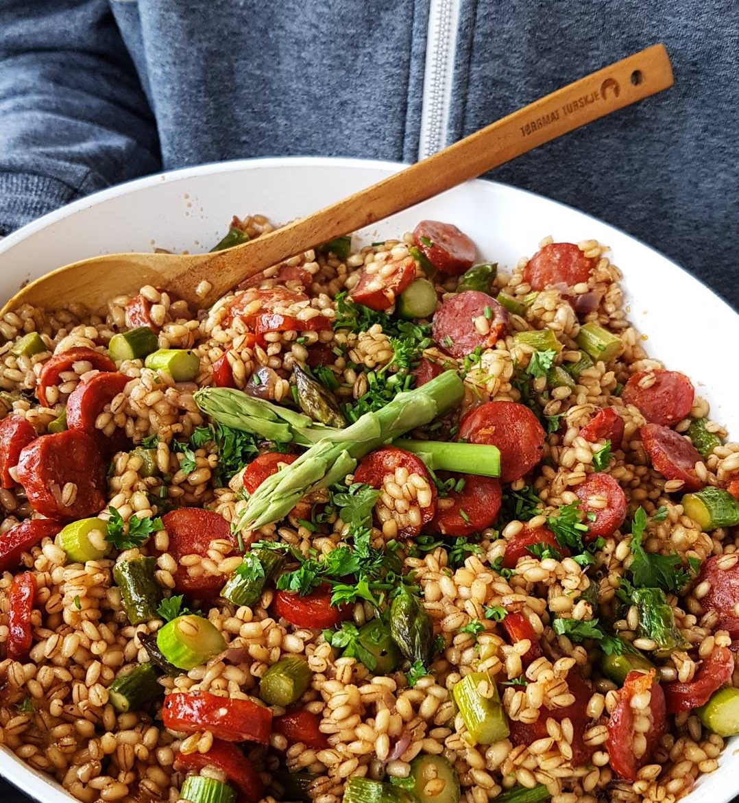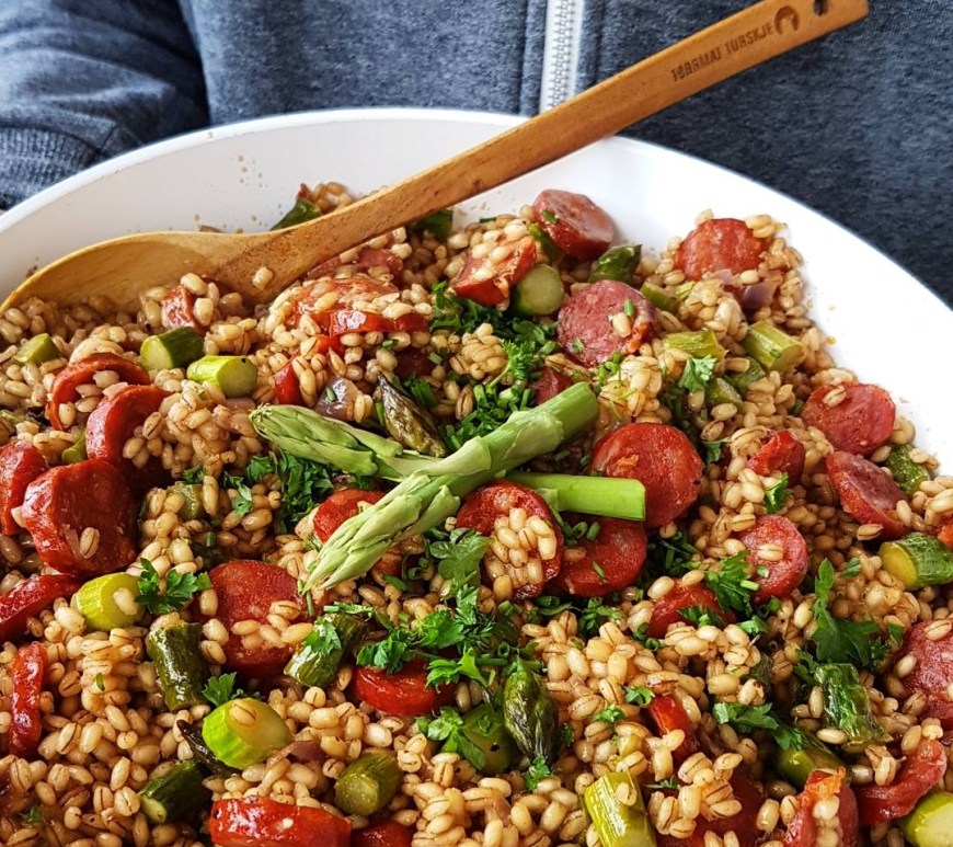 Denne byggrynsalaten er sunn, mettende, frisk og smakfull og kler enhver grillmiddag. Du  kan kle den opp og strippe ned etter hva du har i spiskammerset av grønnsaker, men bruk kokte byggryn, rødløk og frisk mynteblader.  De store hvite bønnene er med fordi jeg digger de, men de supergode og sunne byggrynene bærer strengt tatt denne salaten selv. Med spisse smaker av rødløk, reddik og chili trenger salaten ett søtt innslag og derfor ble den siste finishen frisk mynte. Når Keeper’n sier «det var godt med mynte i».. vel, da føler jeg at jeg har gjort noe riktig. Med barbeque marinert flintstek og sterke merguez Pølseveven smakte det utrolig godt med denne friske byggrynsalaten. Lag en stor porsjon og ha i 2 dager eller til lønsj dagen derpå.