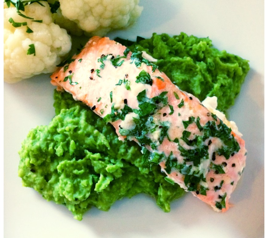 Her får du et raskt, enkelt, sunt og veldig godt middagstips. Laks med urtesmør er godt i seg selv, men det var faktisk den smakfulle ertemosen som var prikken over i’en ved dette måltidet. Ertemosen lages på 6 korte minutter og smaker friskt med persillesmør og et hint av chili og hvitløk. Jeg valgte å servere blomkål til, men du kan jo velge selv hva du vil ha av tilbehør som poteter, gulrot osv..