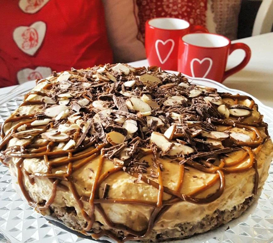 Jeg er hverken flink eller glad i å bake og blir aldri noen kakeblogger, men denne sinnsykt deilige kalaribomben med karamellisert melk (dulche de leche), krem, mascarpone og nøtter må jeg bare dele! Jeg slang kaken sammen uten oppskrift og egentlig helt på måfå. Resultatet ble himmelsk!! Karamellkaken er vanvittig enkel å lage og den skal ikke stekes, men stå litt i fryseren. Kakebunnen er kun nøtter og smeltet smør. Toppingen er en mix av vispet krem, mascarpone og dulche de leche. Kaken er pyntet med karamell, revet sjokolade og mandelflak. Jeg sprang mammapoeng-barometeret når denne karamellkaken kom på bordet og jeg er redd jeg endelig har funnet en kake jeg gidder å lage igjen. Dette blir kaken å servere i desemberbursdag og på nyttårsaften.